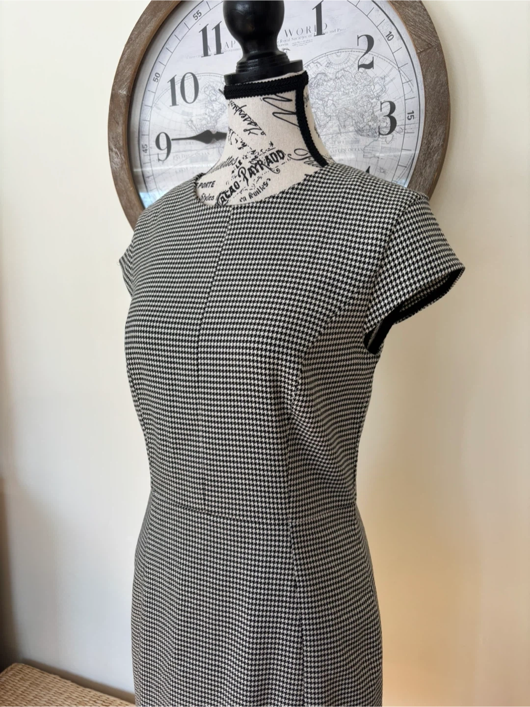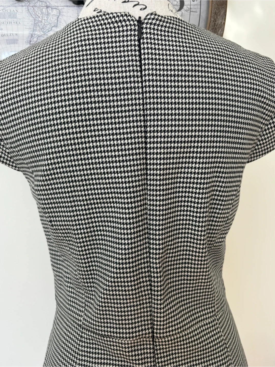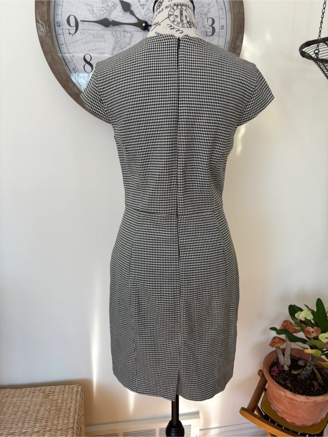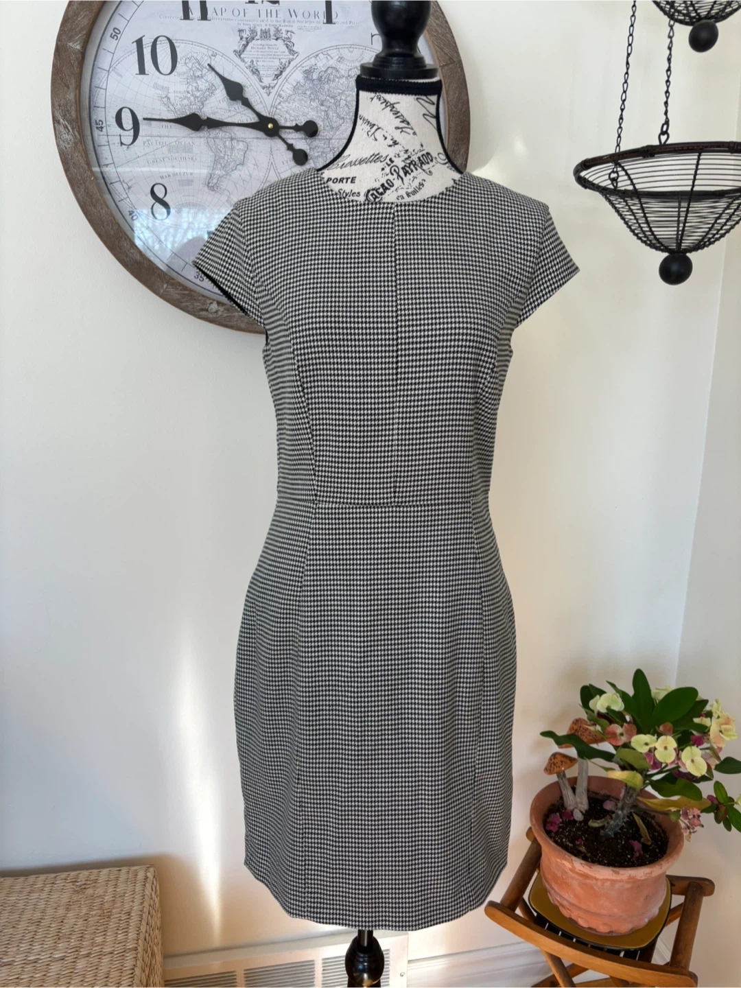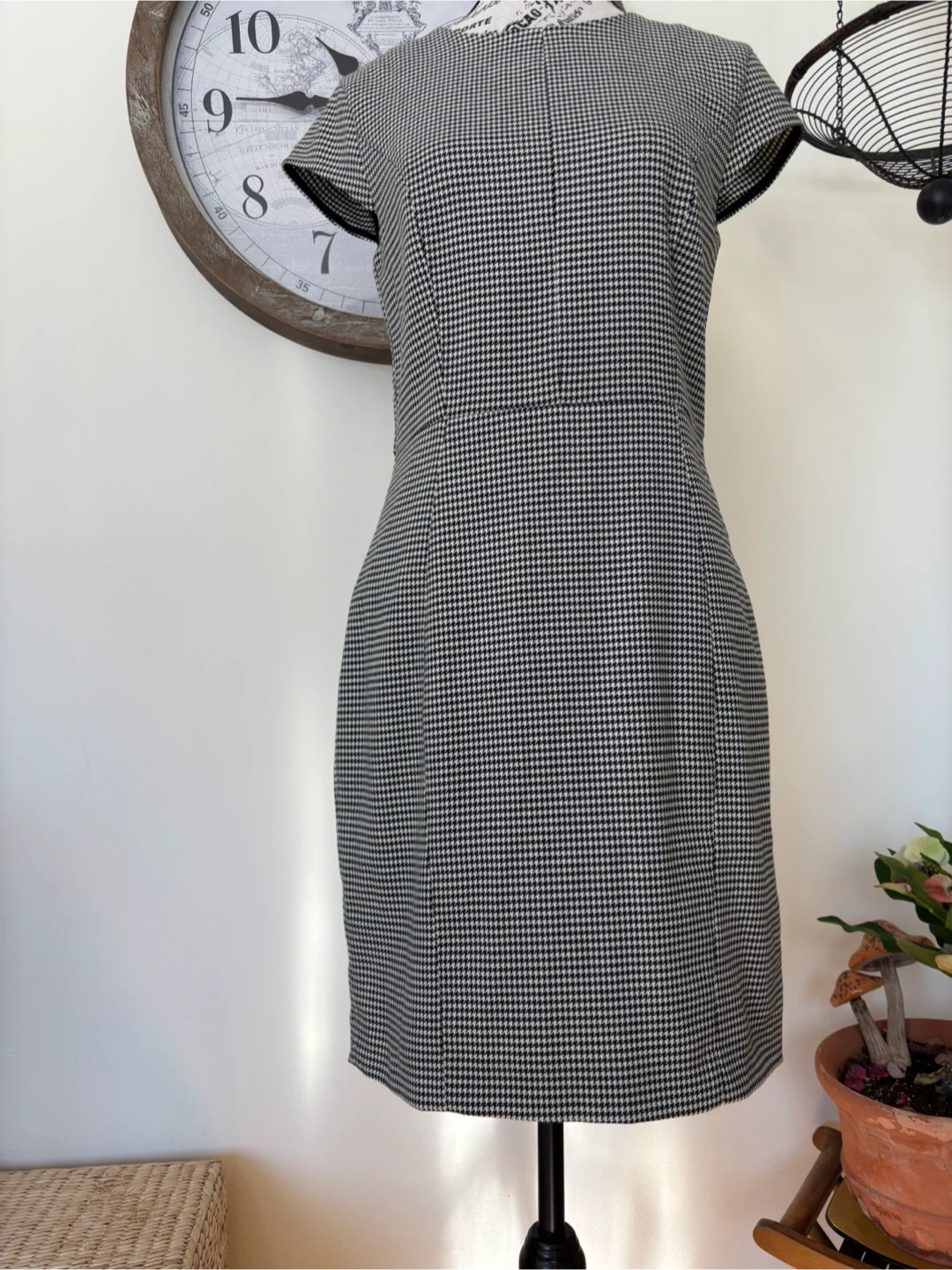 This classic houndstooth sheath dress features a flattering silhouette. It's perfect for business casual settings or a polished evening out. I got it in Portugal. Internally lined as well. Size 6. Cash only.