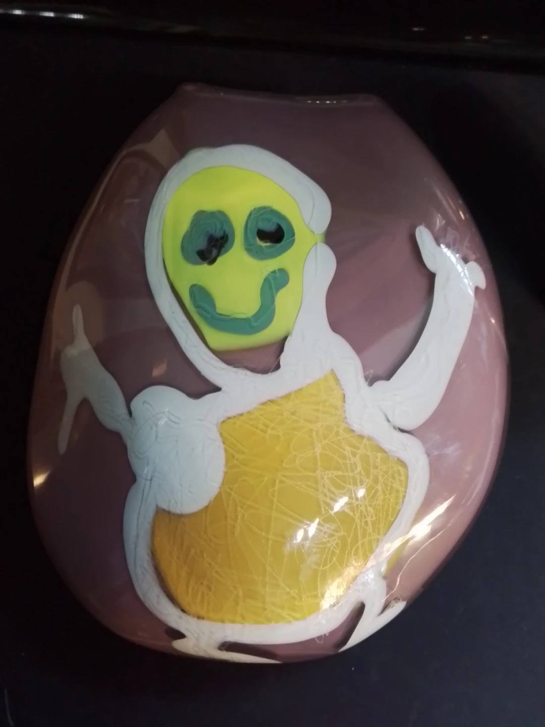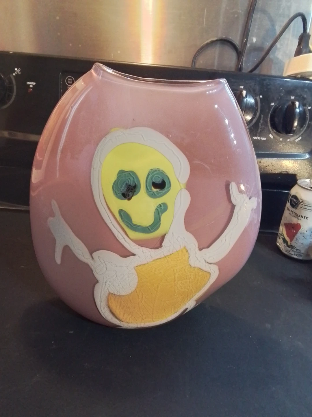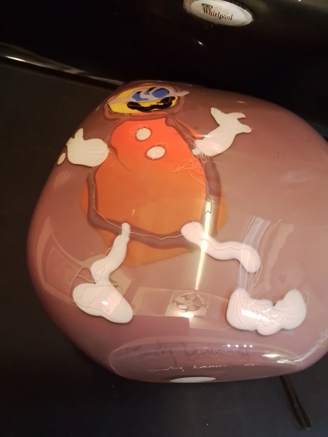 This art glass vase, signed by Timothy Lauren, stands approximately 10 inches tall and 9 inches wide, making it a striking decorative piece. Bearing the signatures from 1985 this vintage piece is a must-have for collectors. Its unique design is sure to be a conversation starter, adding character to any room it graces.