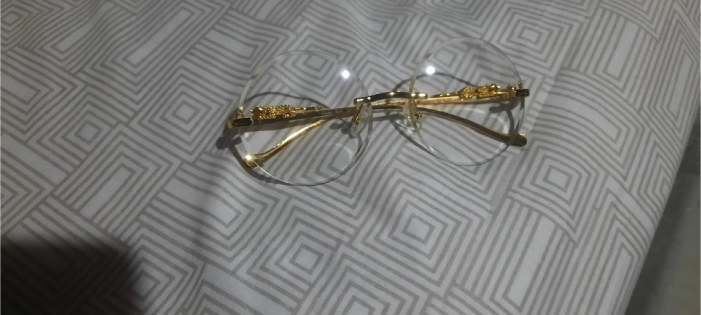 992A pair of rimless glasses with a gold frame! These glasses feature a unique design and are in great condition. They add a touch of elegance to any look