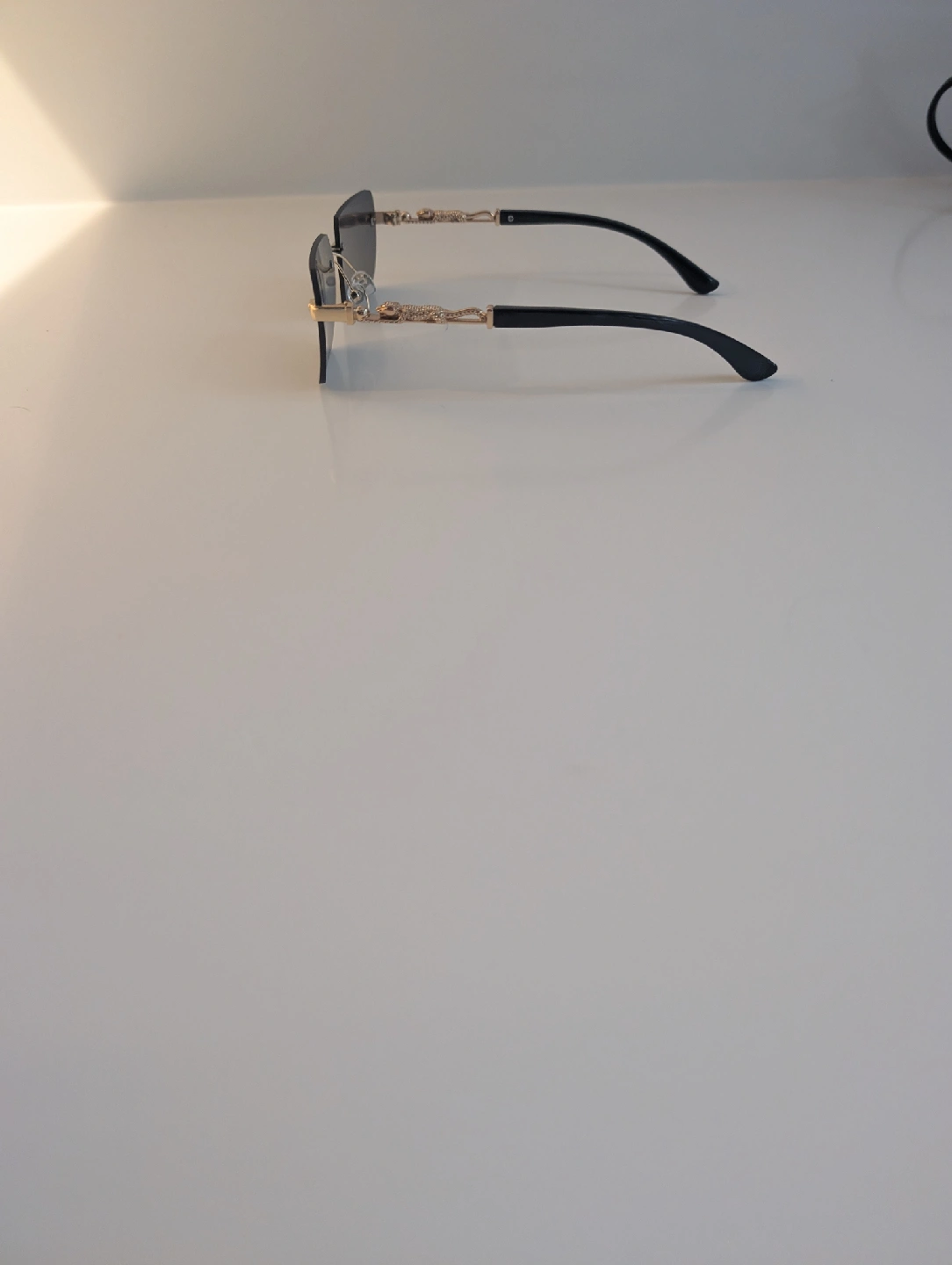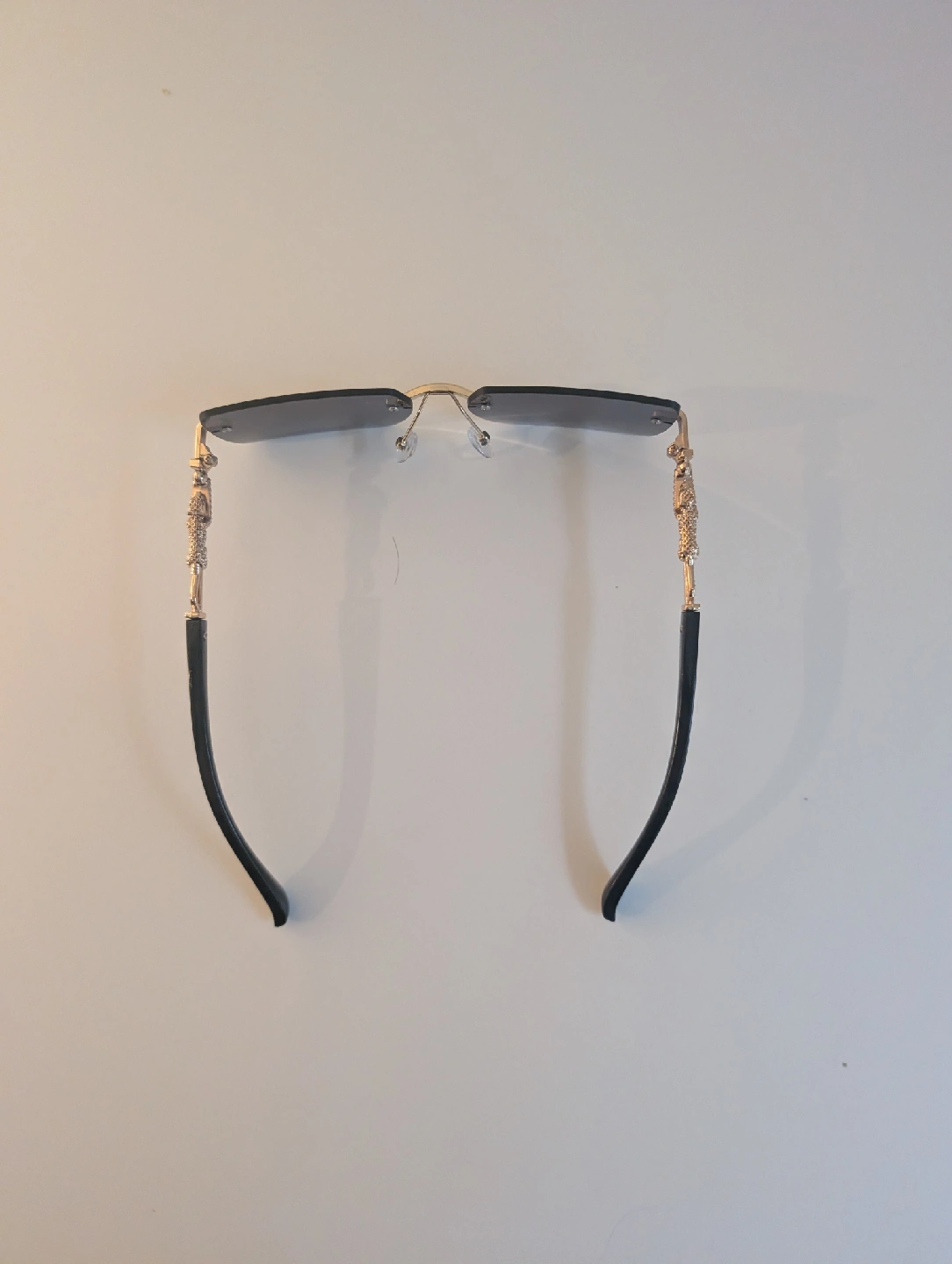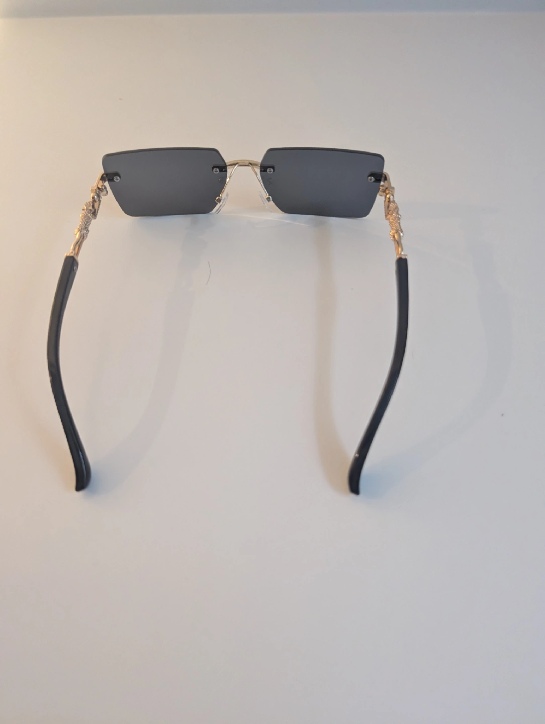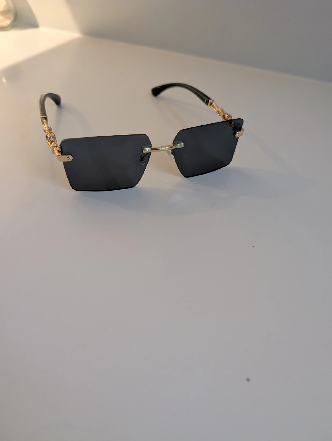 Selling a pair of rimless sunglasses with unique gold detailing on the sides! They have black frames and are in great condition. These shades are sure to make a statement