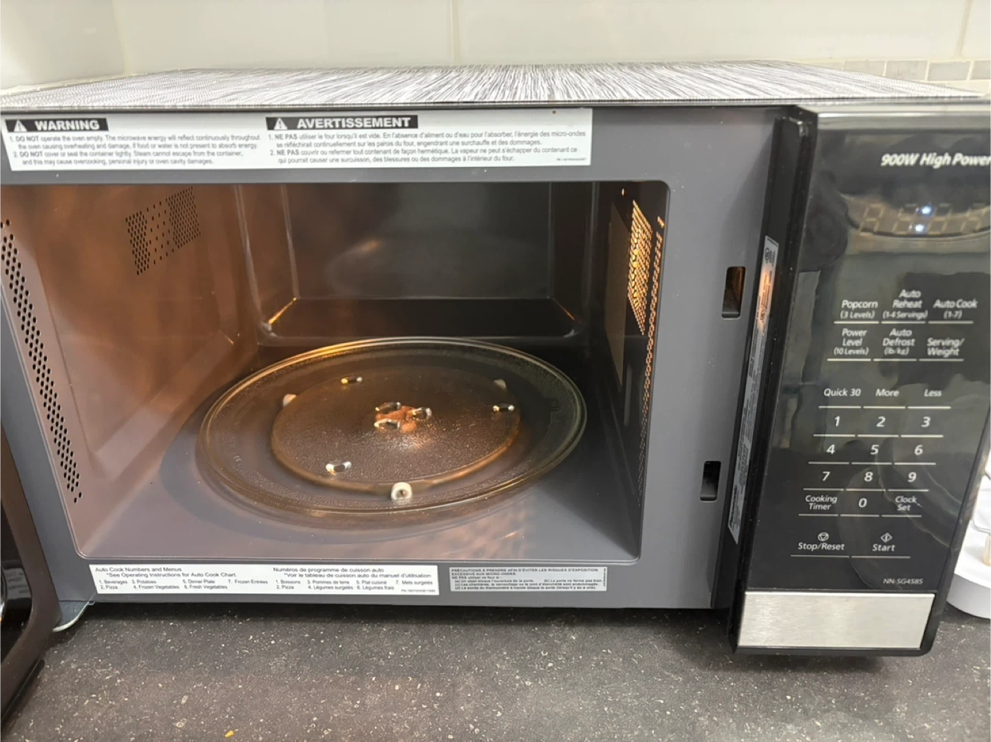 This is a Panasonic microwave oven. It has 900W high power for quick cooking. Features include auto cook and defrost settings.