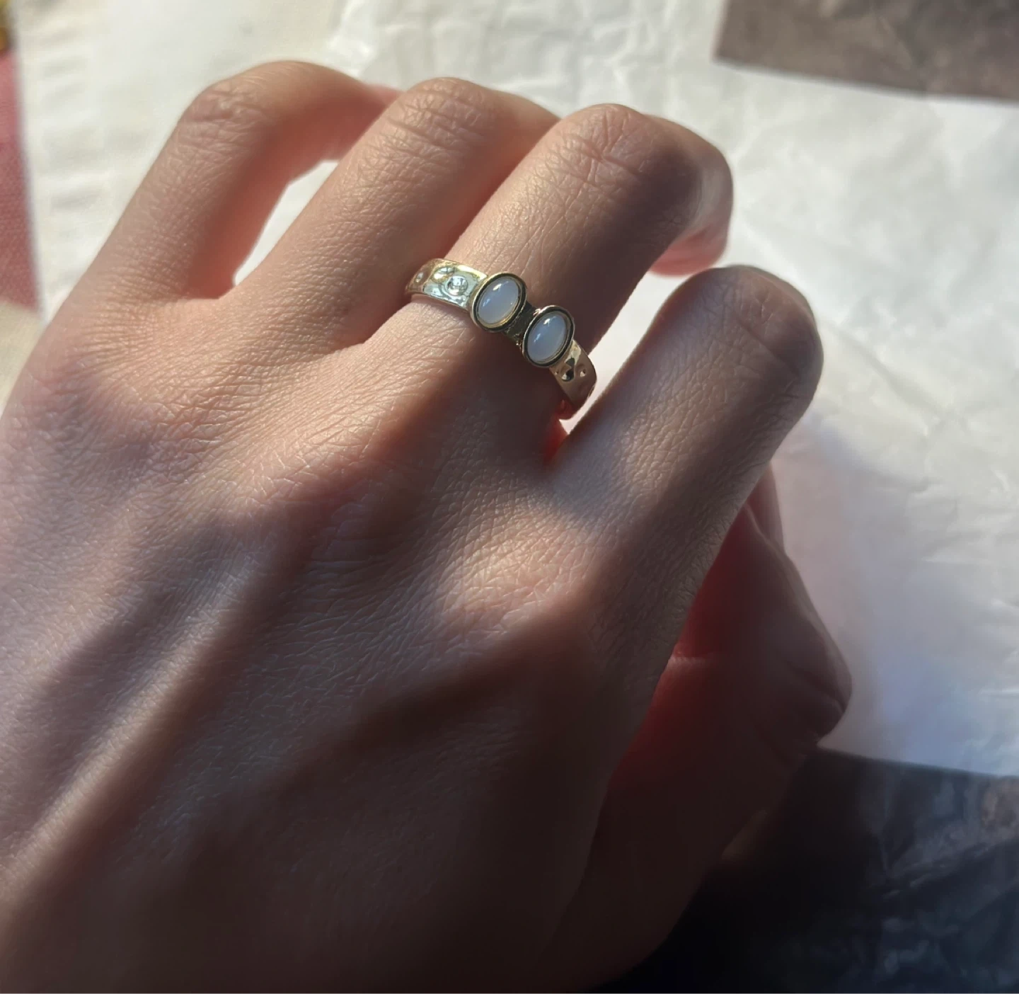 81A lovely gold ring featuring two white stones. It's in great condition and ready for a new home! sized around 1.6cm