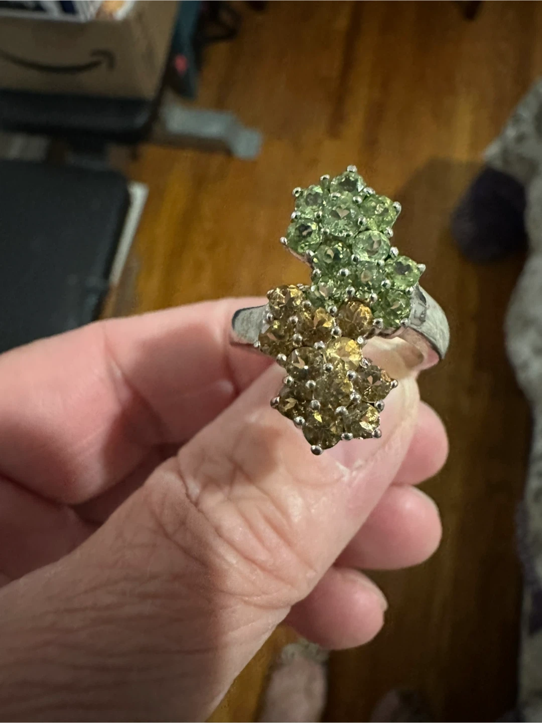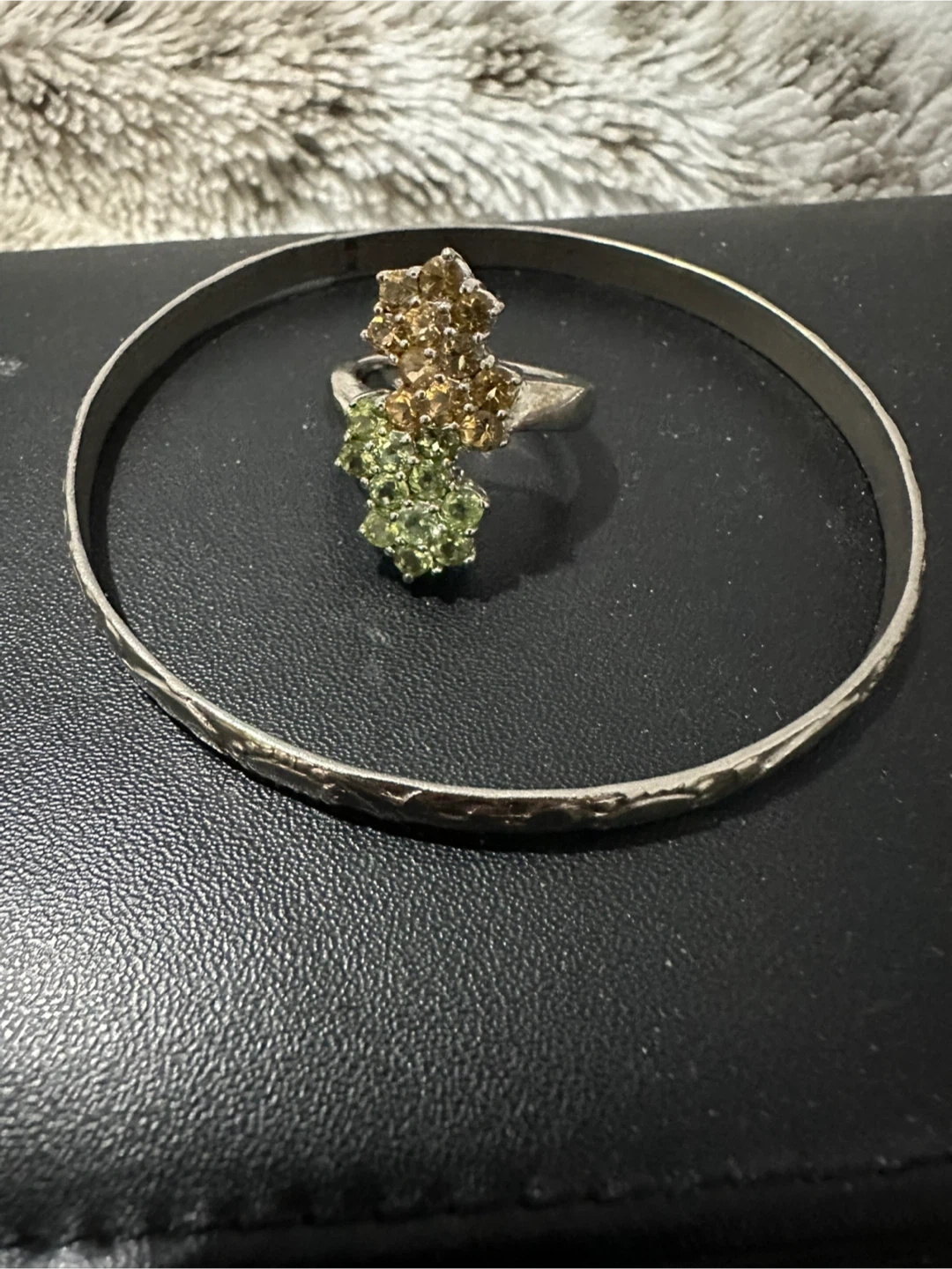 871Selling a ring with green and amber stones, along with a silver bangle. They're in good condition! No missing stones, ring is stamped 925 sterling silver. Smoke free home. Ring is size 7