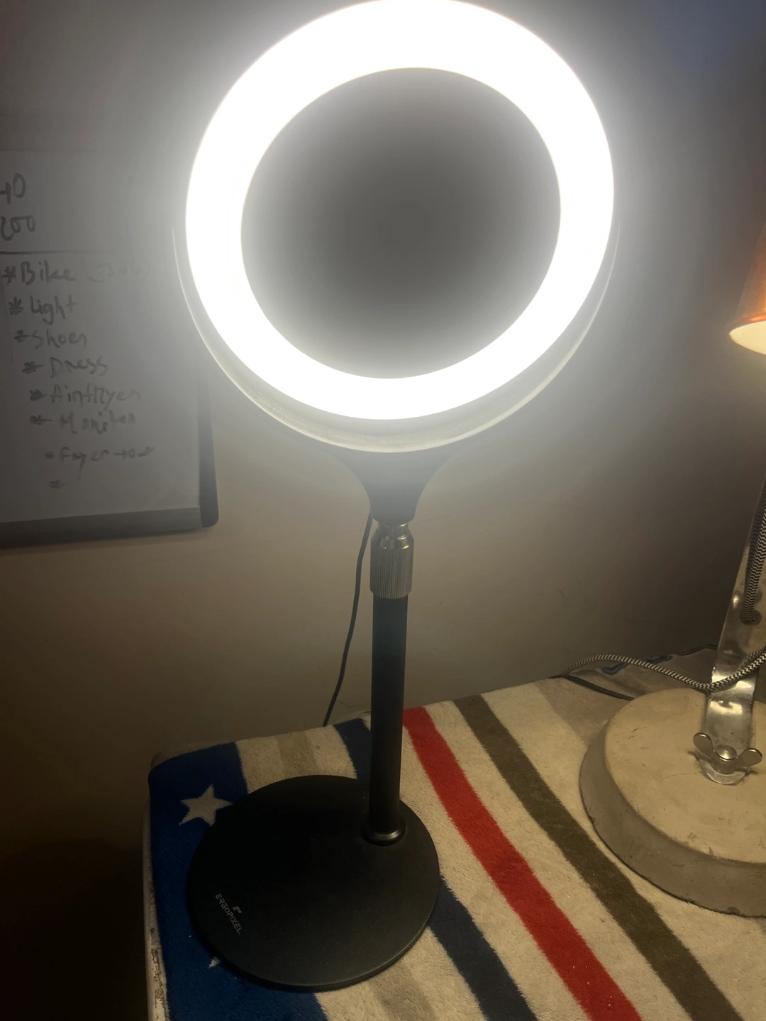 LED ring light. Adjustable stand. Black base. Perfect for makeup or video calls.