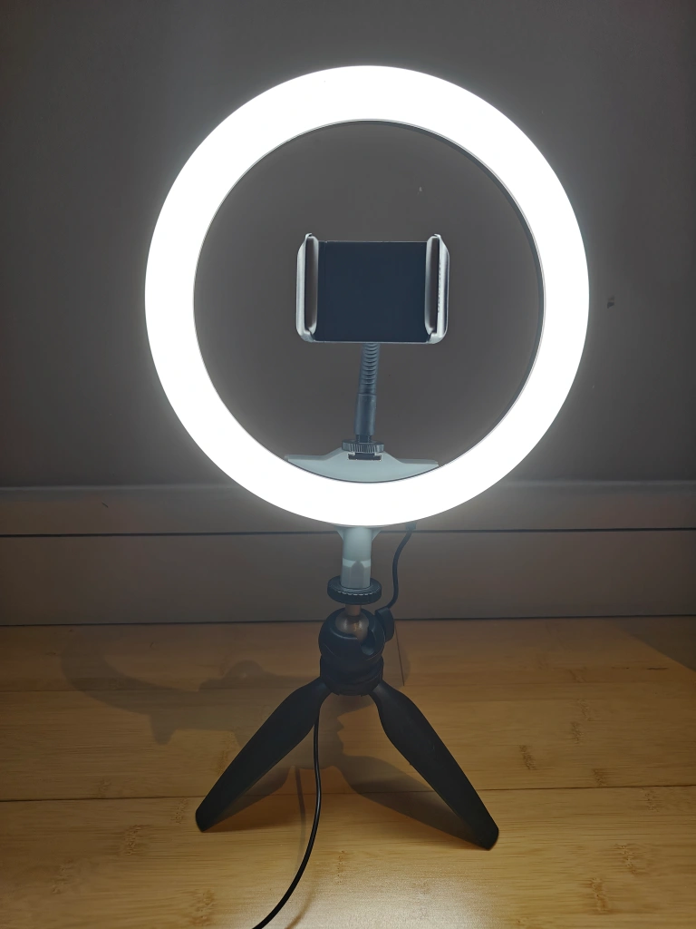 Perfect for content creators, video calls, or makeup. This compact tabletop ring light comes with a built-in phone holder, making it easy to go hands-free. Features: Three light modes: warm, cool, and natural white Adjustable brightness – dim or brighten to your liking Flexible phone holder – fits most smartphones Stable tabletop base USB-powered – just plug it in and go! Works great and is in excellent condition. Ideal for desks, vanities, or small workspaces.