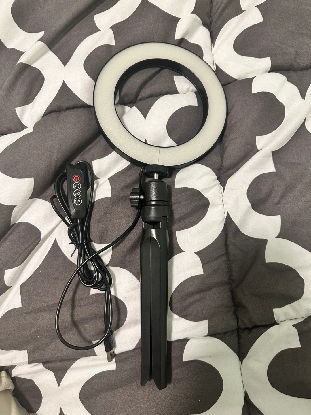 Portable ring light in a mini tripod. There are 3 colors of light and you can adjust the brightness. Great for selfies and videos. It has 1 crack on the white part of the ring but doesn't affect its job. Asking $15