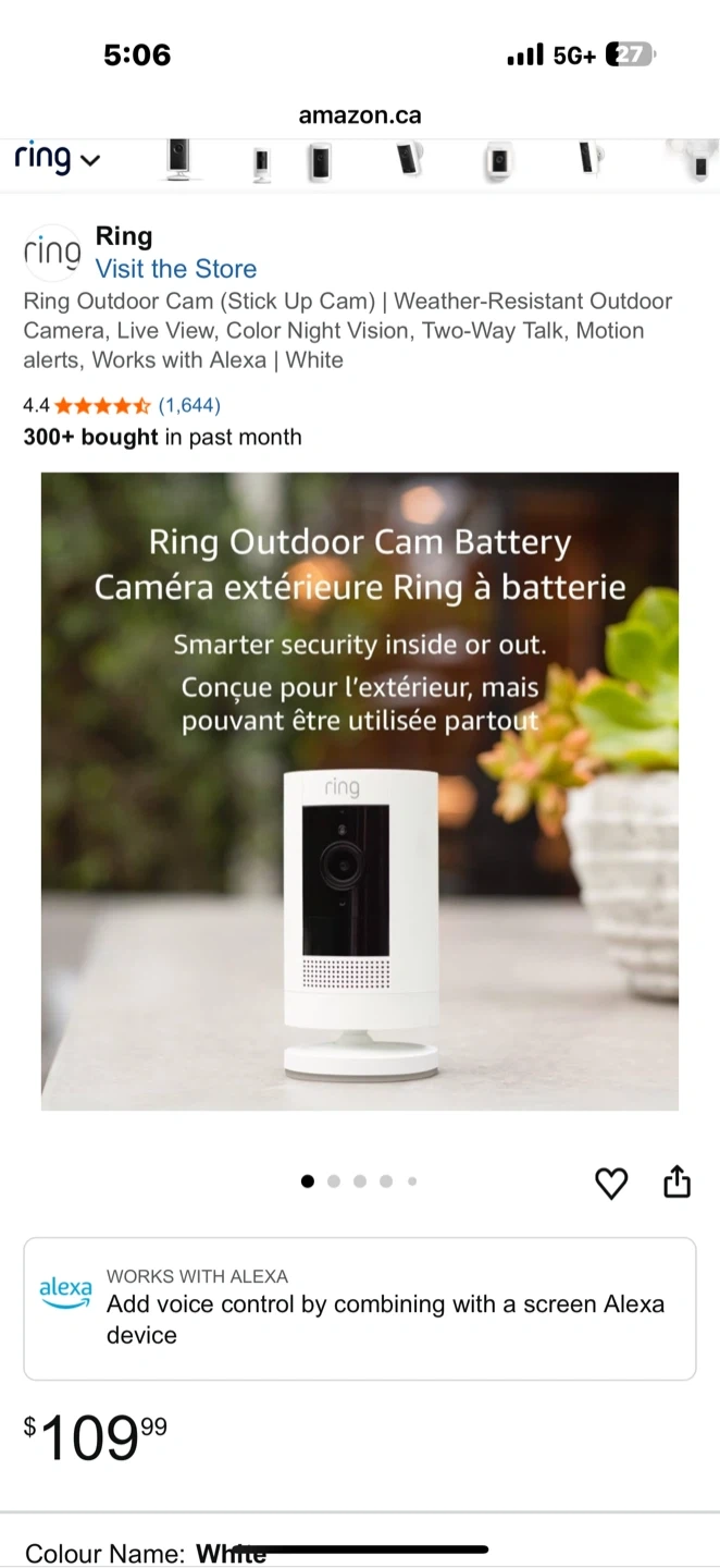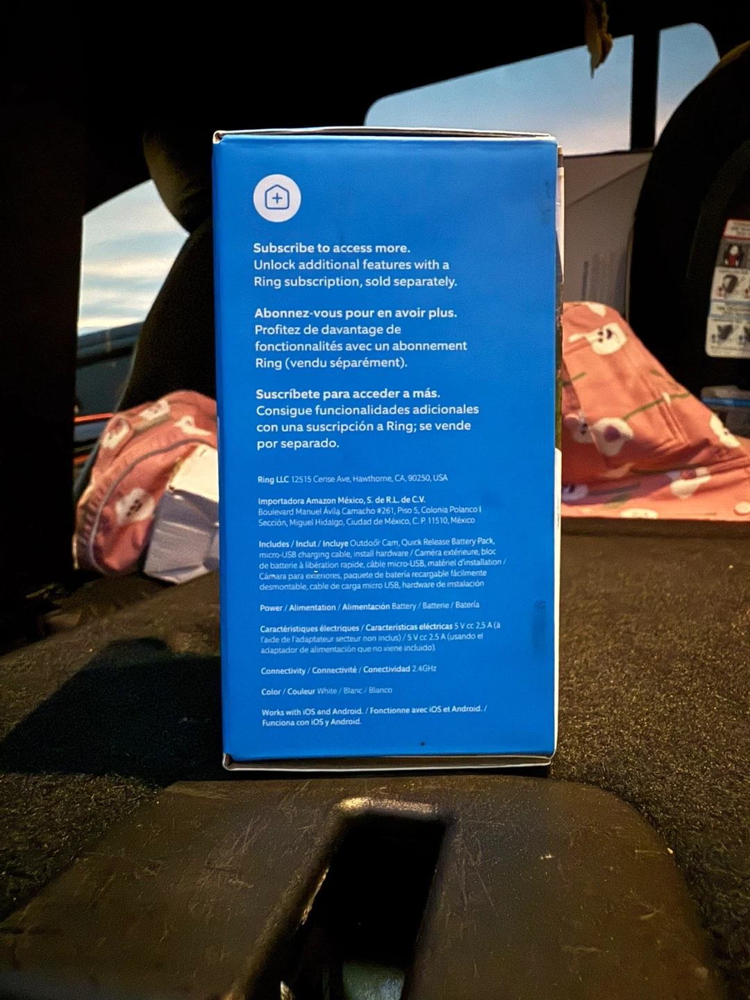 40Selling a Ring Outdoor Cam in white. It’s brand new in the box and comes with everything you need to set it up, including the camera, battery pack, USB charging cable, and install hardware. It retails for $109.99. I’m asking $80, obo Pickup in Silverado. Delivery is available for a gas fee depending on where you’re located. Check out my other listings!