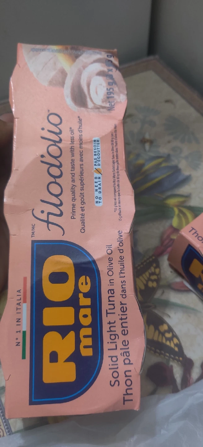 1000+Selling Rio Mare Solid Light Tuna in Olive Oil. It is a product of Italy. Each can is 195g. The packaging says 'Prime quality and taste with less oil'.If you cannot pick up soon please dont ask to reserve