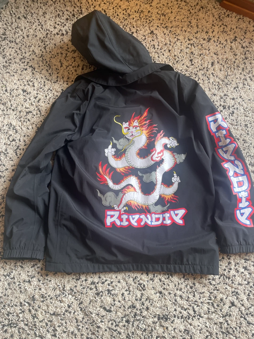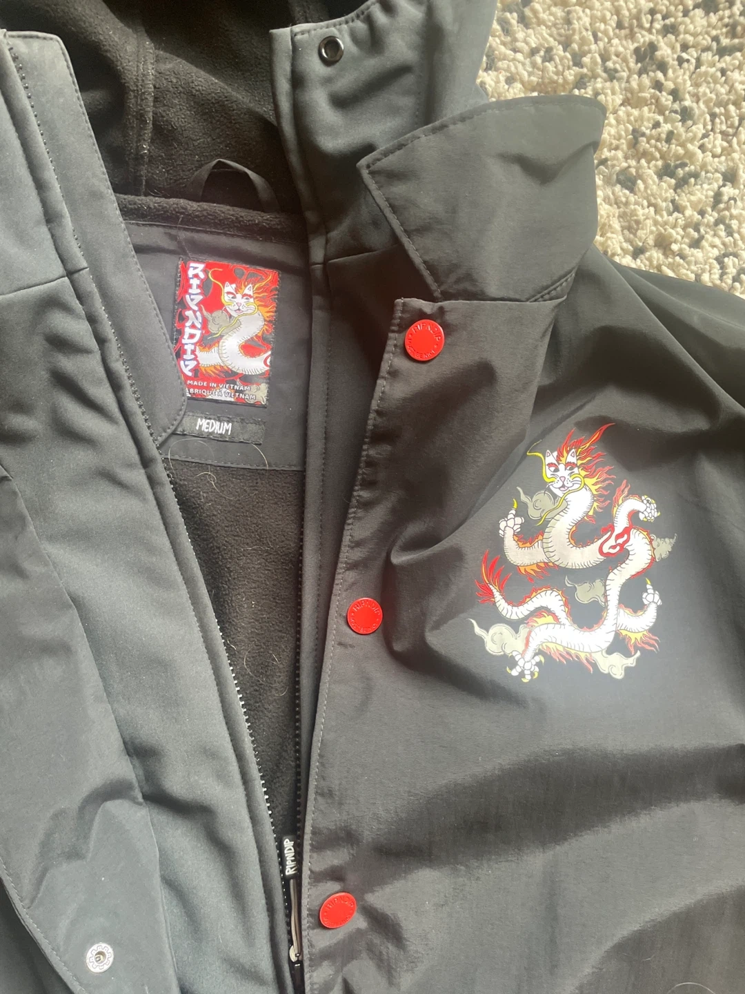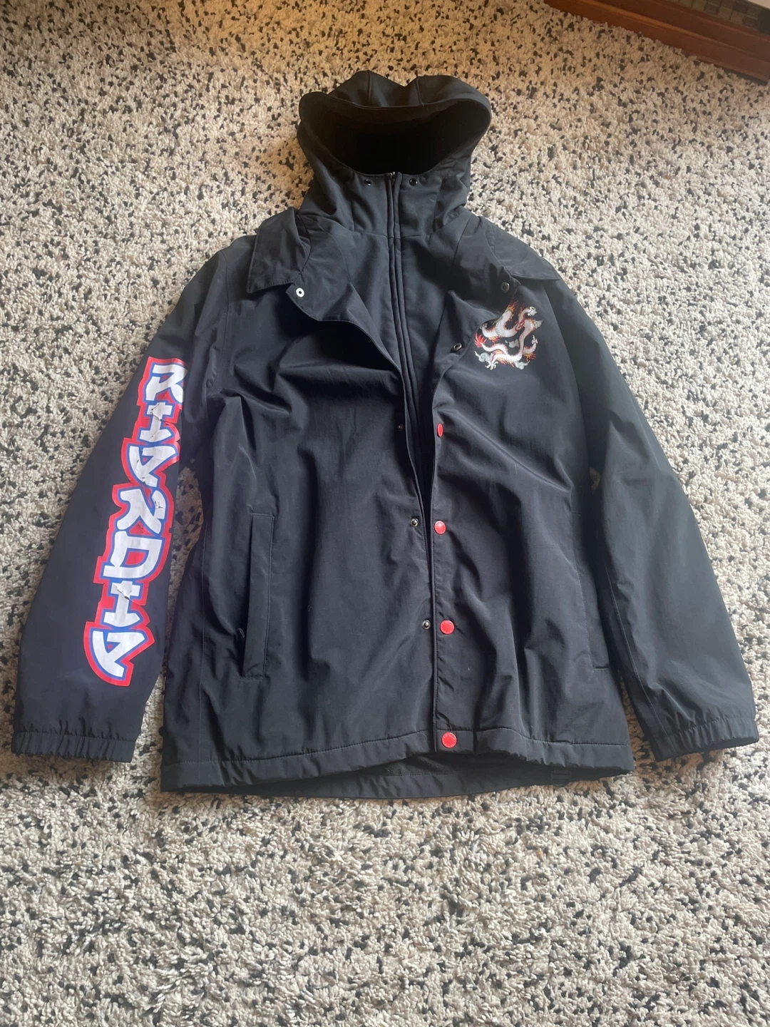 46Selling a Ripndip black snowboard jacket with a dragon design. It's a size medium and in great condition. The jacket features the Ripndip logo and Japanese text on the sleeves. Perfect for adding a unique touch to your wardrobe!