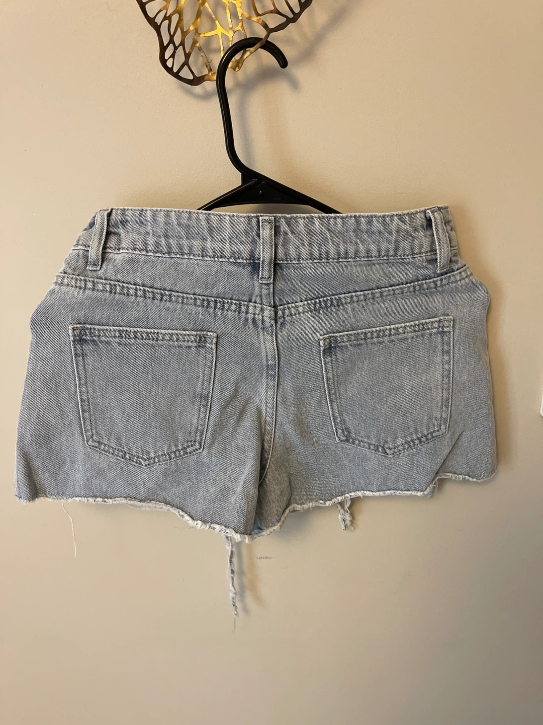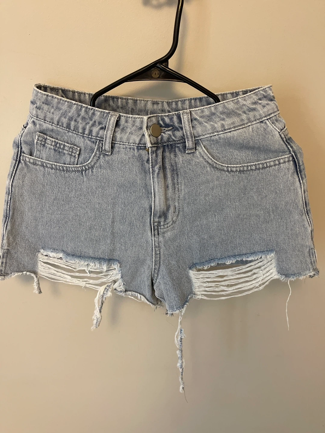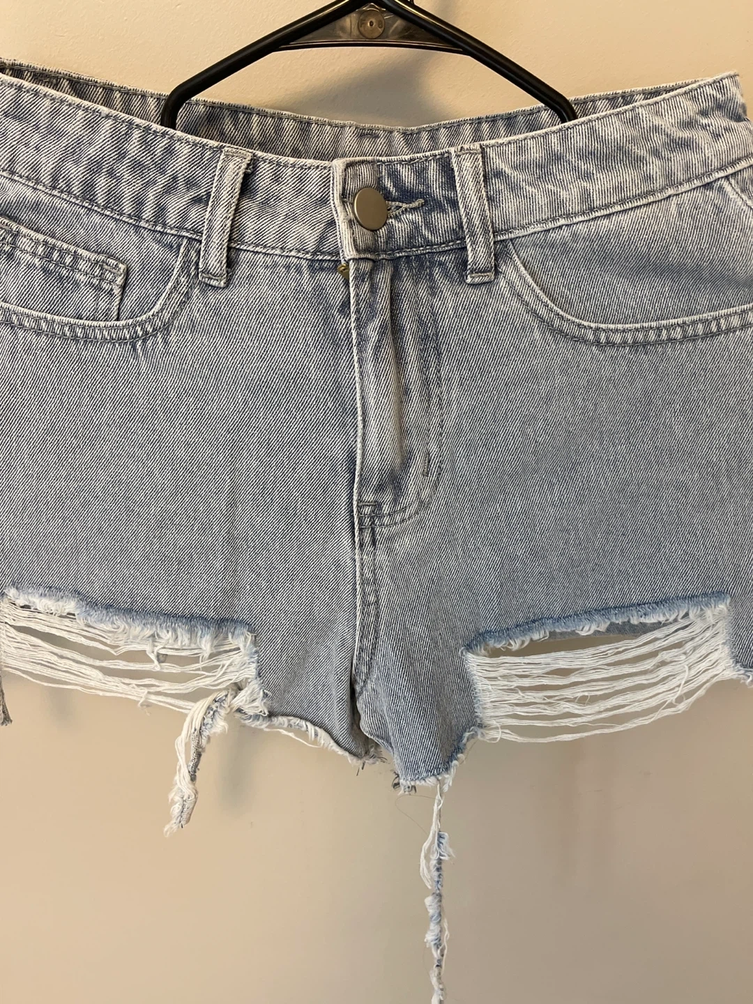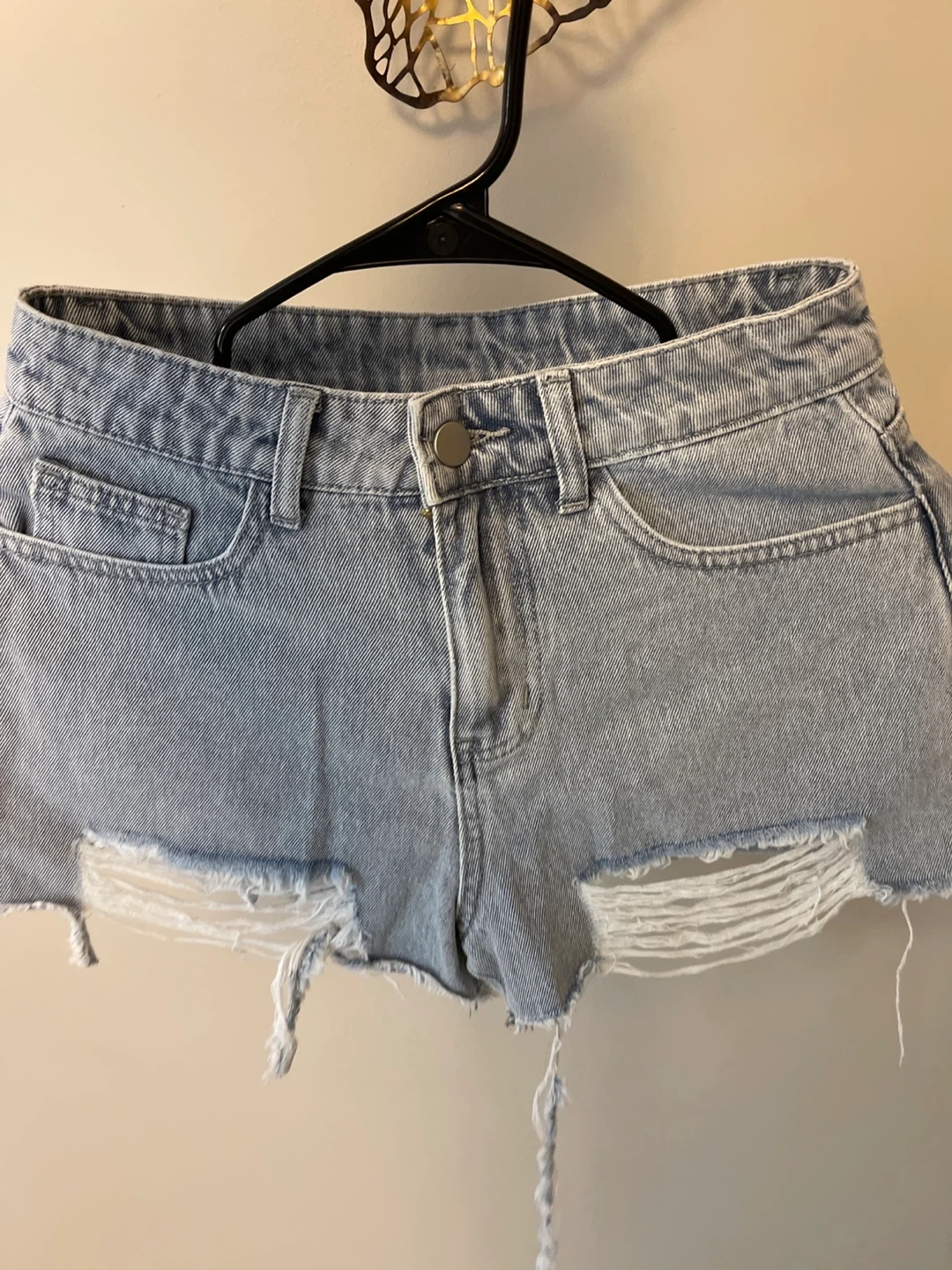 25Selling a pair of light wash denim shorts with a trendy ripped hem. These are perfect for a casual summer look!