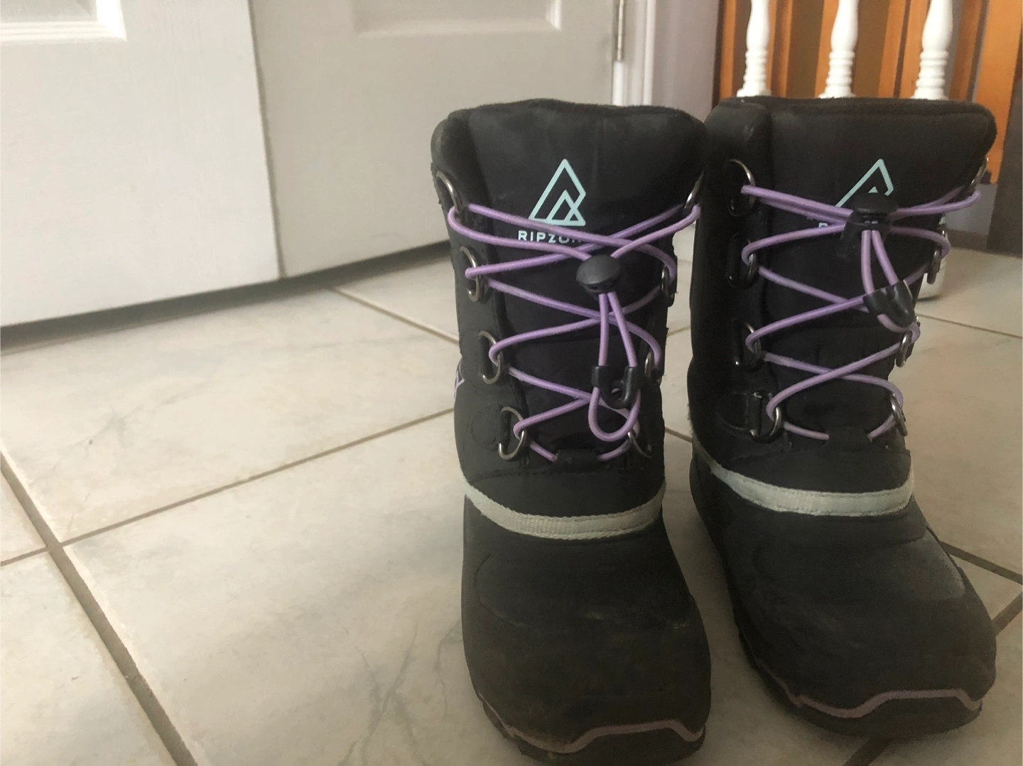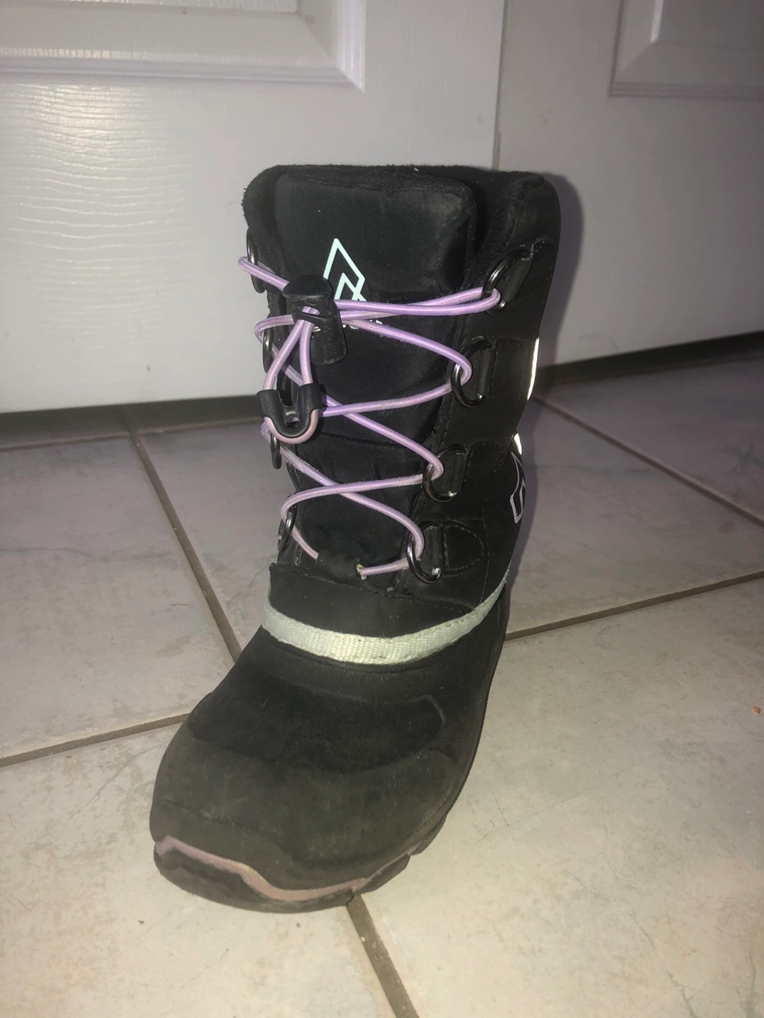 These Ripzone snow boots are perfect for keeping your little one's feet warm and dry this winter! They feature a black exterior with purple laces and a reflective stripe. The boots are in good used condition and ready for some snowy adventures. Size 11