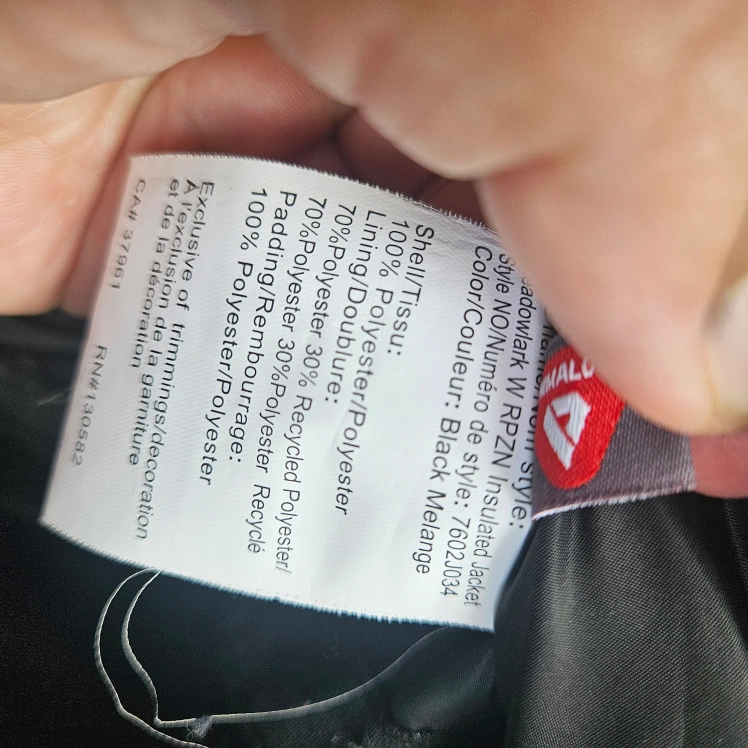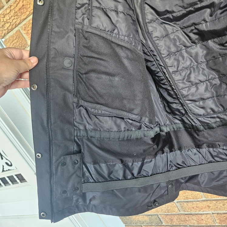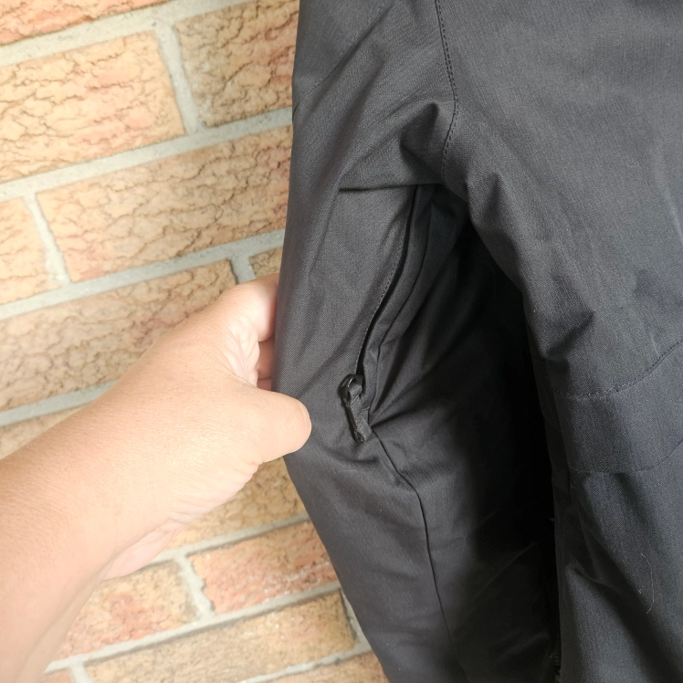 Ripzone woman's or unisex...check measurments XL 8K breathable 8K waterproof Detachable faux fur on hood ATTACHED hood lots of pockets in and out inside bottom elastic to keep wind/snow out 100% poly length 30" Sleeve 26" pit to pit 21" made in China