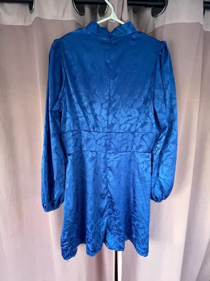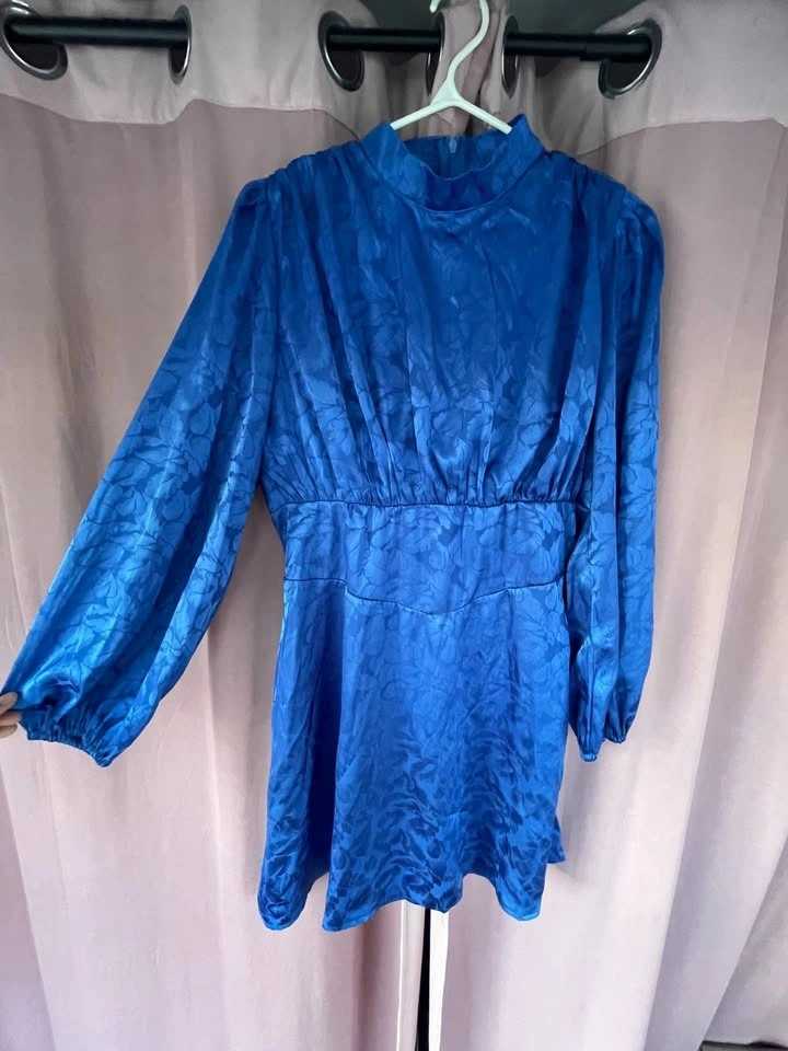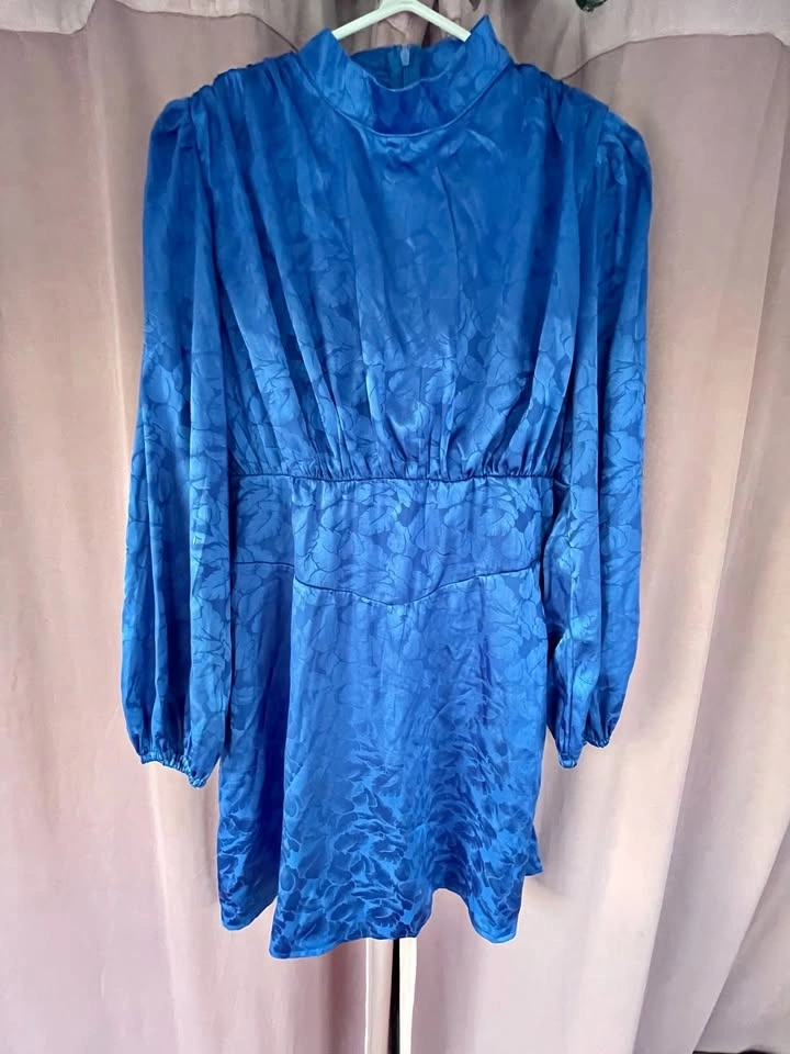New with tags - deep blue mini dress with a retro silhouette, high neck, and chic long sleeves.