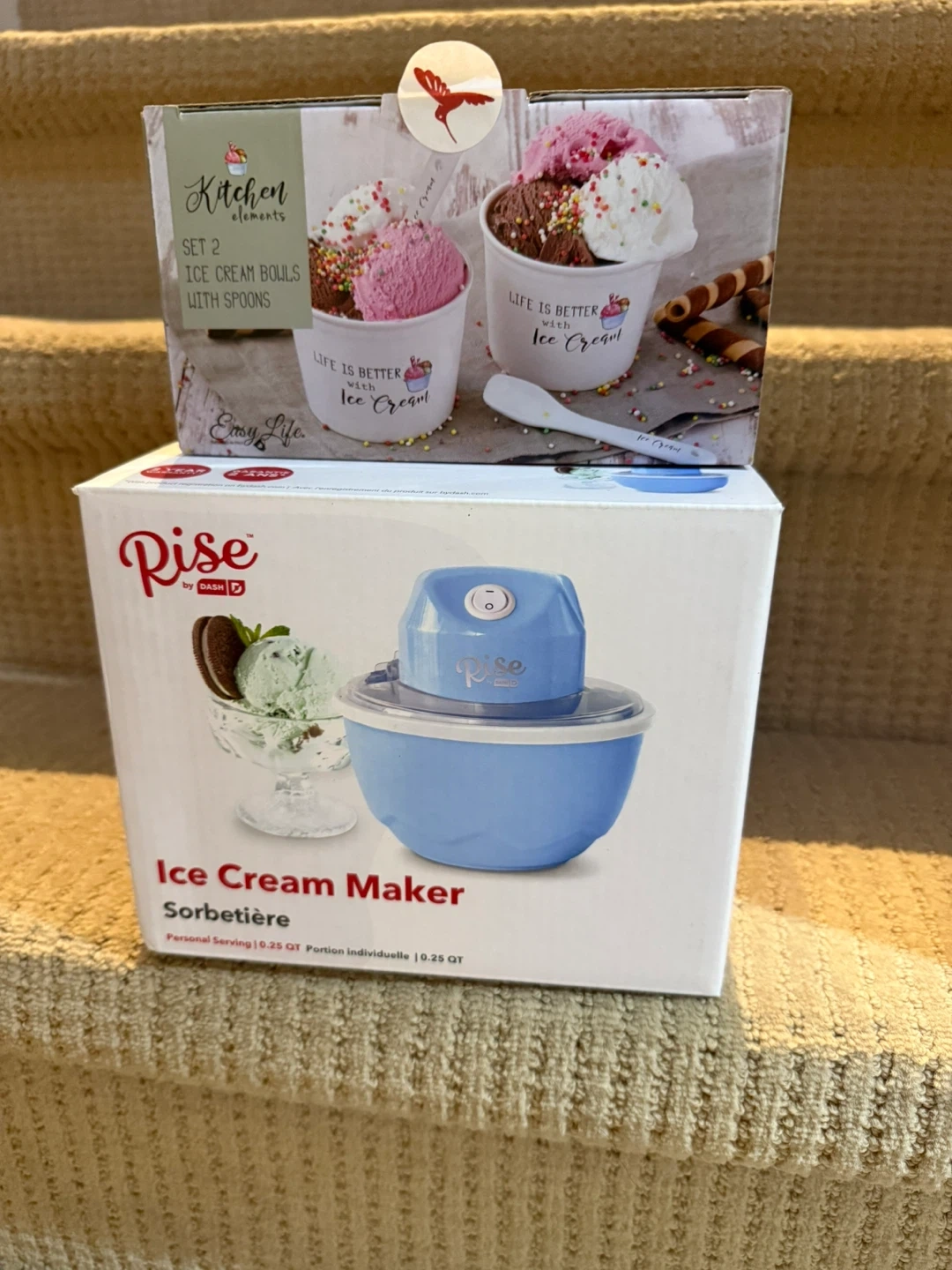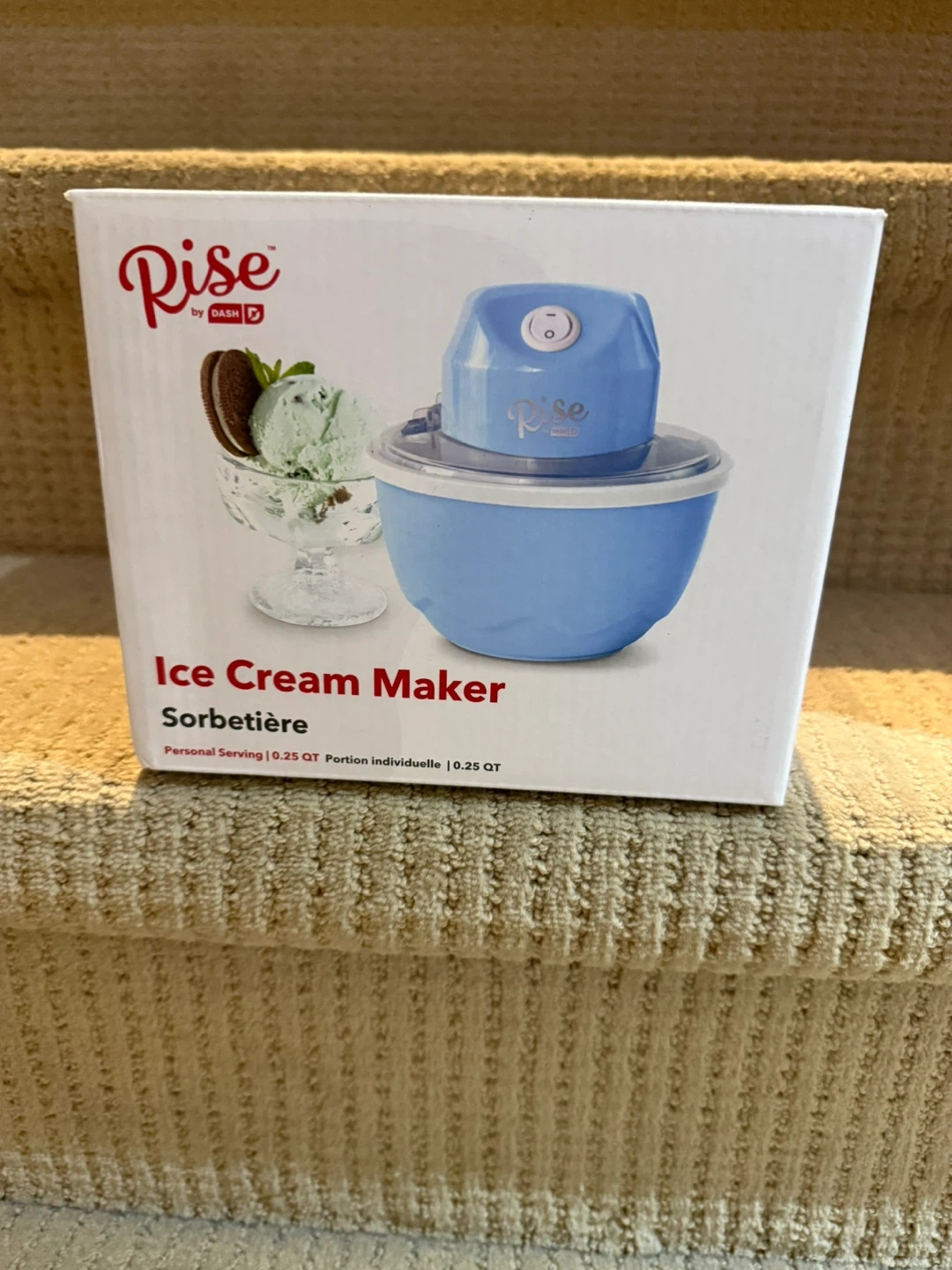 Selling a Rise by Dash Ice Cream Maker (Sorbetiere) for personal serving sizes of 0.25 QT. Also included is a Kitchen Elements set of 2 ice cream bowls with spoons. Perfect for making and enjoying your favourite frozen treats!