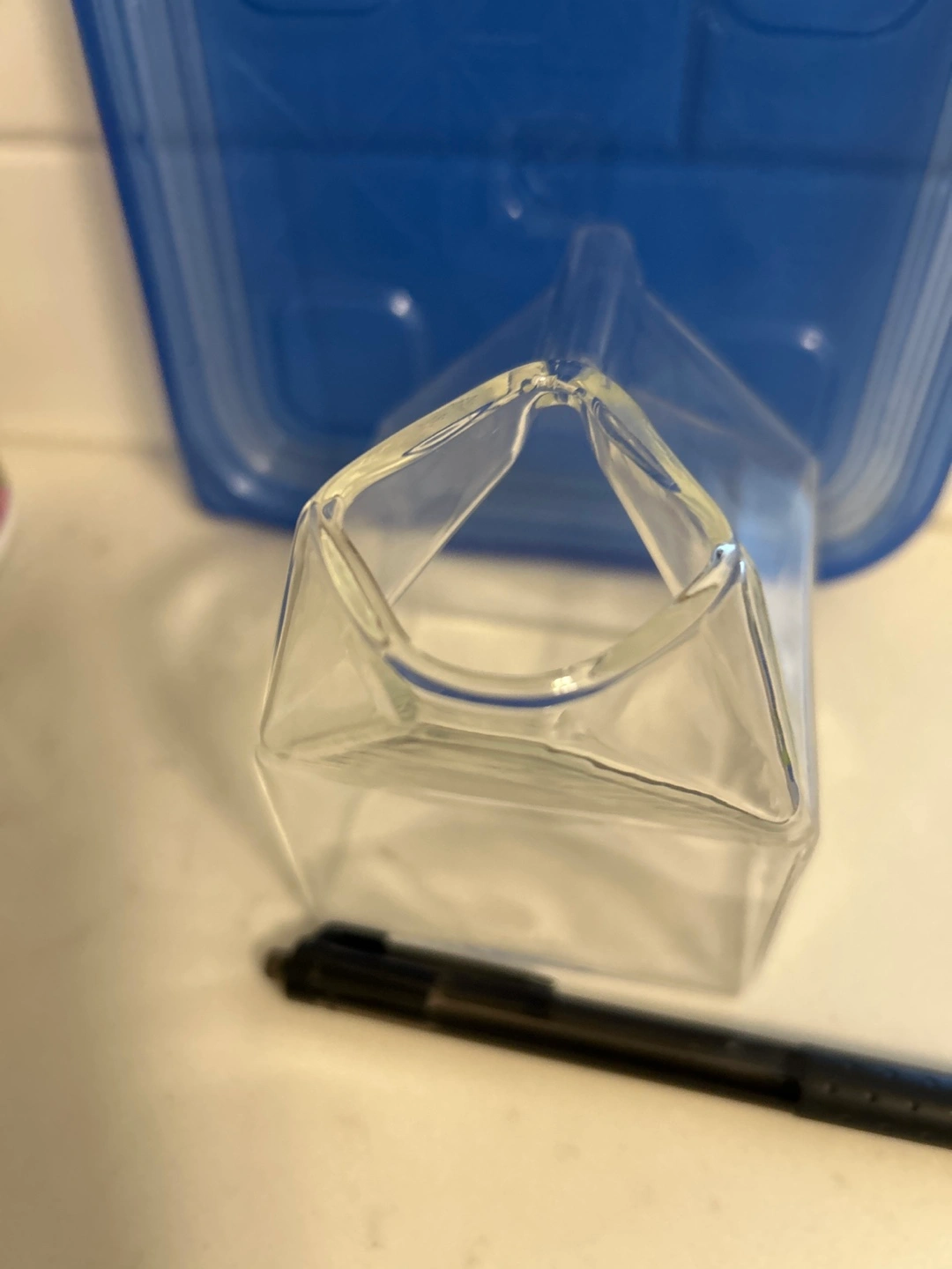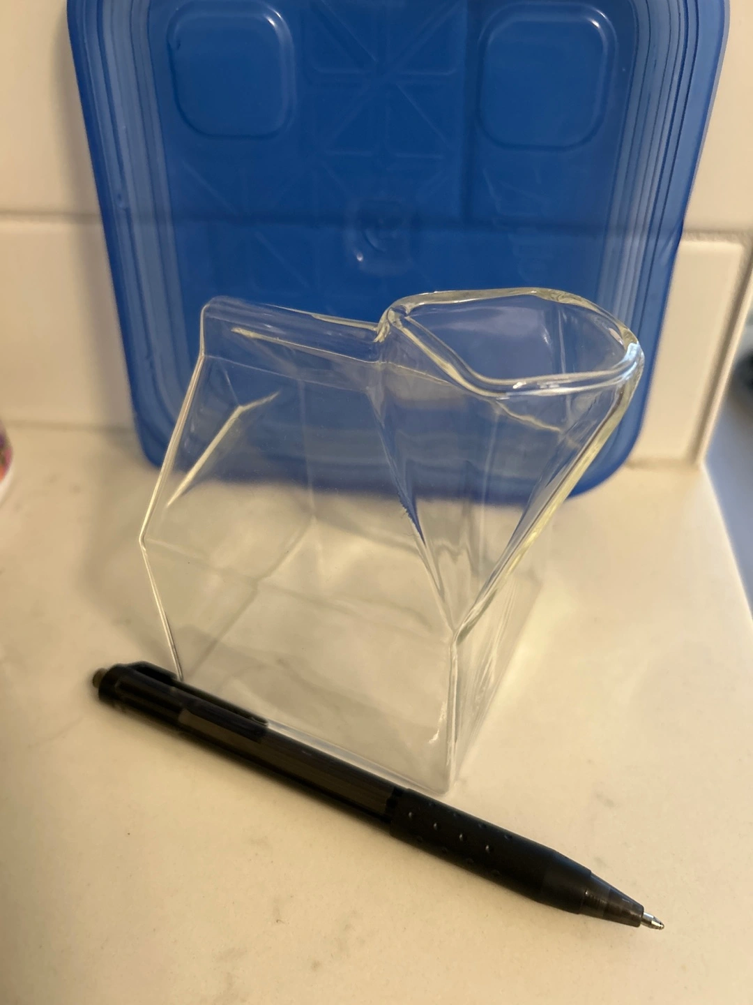 This is a clear glass holder shaped like a miniature milk carton. It's perfect for holding small items or as a unique desk accessory. Glass material.