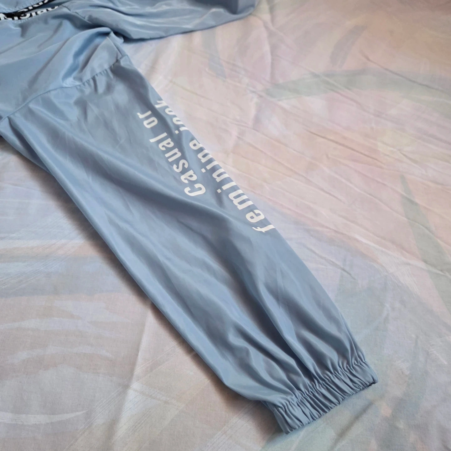 Selling a thin, light blue windbreaker that has side pockets and a hood