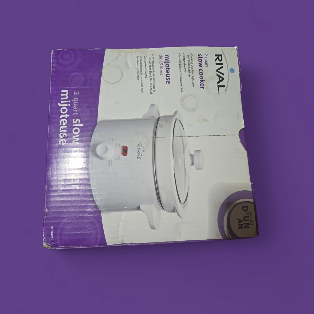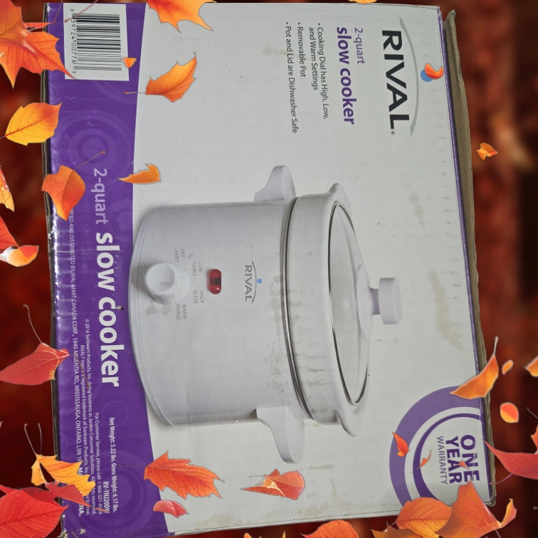14White 2-quart slow cooker. Includes one year warranty. Cooking settings: High, Low, and Warm. Pot and lid are dishwasher safe.