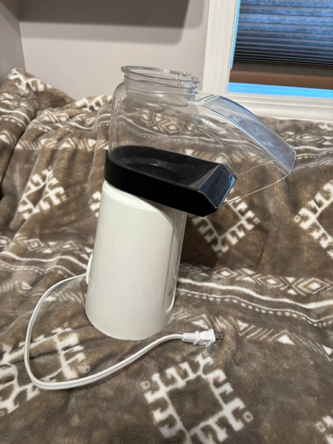 White popcorn machine. Compact design. Includes clear, removable top. Good for small spaces.