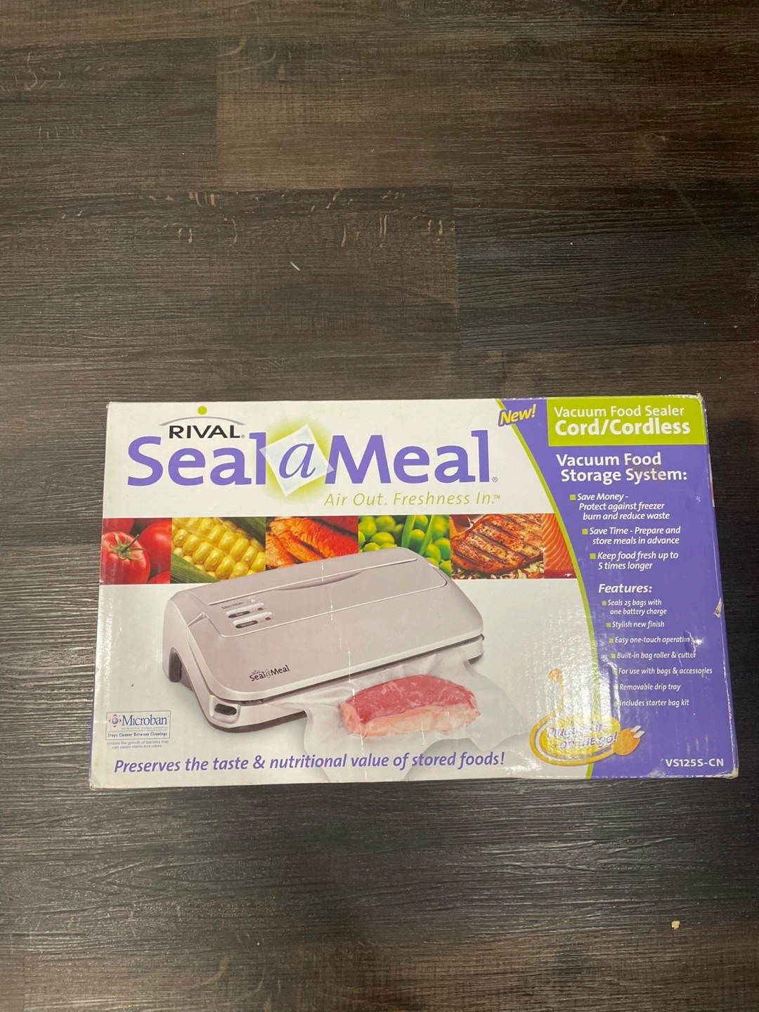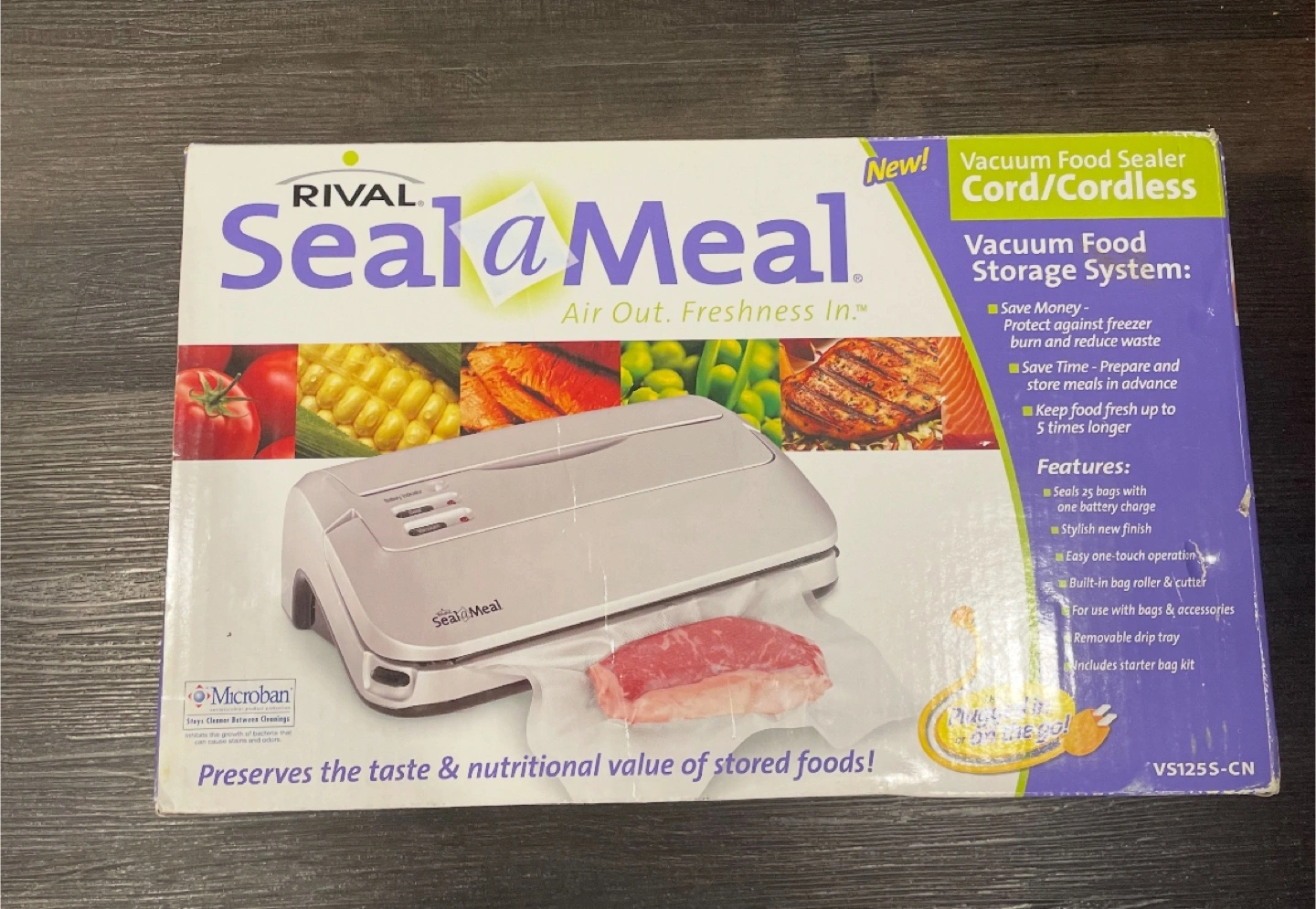 Selling a Rival Seal-a-Meal vacuum food sealer! It's a cord/cordless model and comes with a vacuum food storage system. Here are some features: - Seals 25 bags with one battery charge - Stylish new finish - Easy one-touch operation - Built-in bag roller and cutter - For use with bags & accessories - Removable drip tray - Includes starter bag kit It helps save money, protect against freezer burn, reduce waste, save time preparing and storing meals in advance, and keep food fresh up to 5 times longer