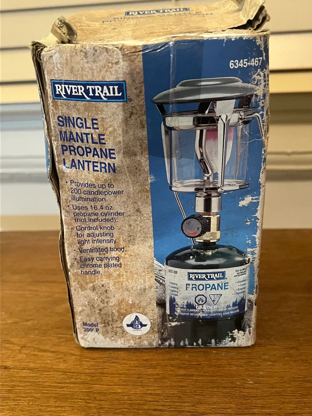Selling a River Trail single mantle propane lantern! It provides up to 200 candlepower illumination. It uses a 16.4 oz propane cylinder (not included). It also has a control knob for adjusting light intensity and a ventilated hood. The lantern also has an easy carrying chrome plated handle and comes with the original box