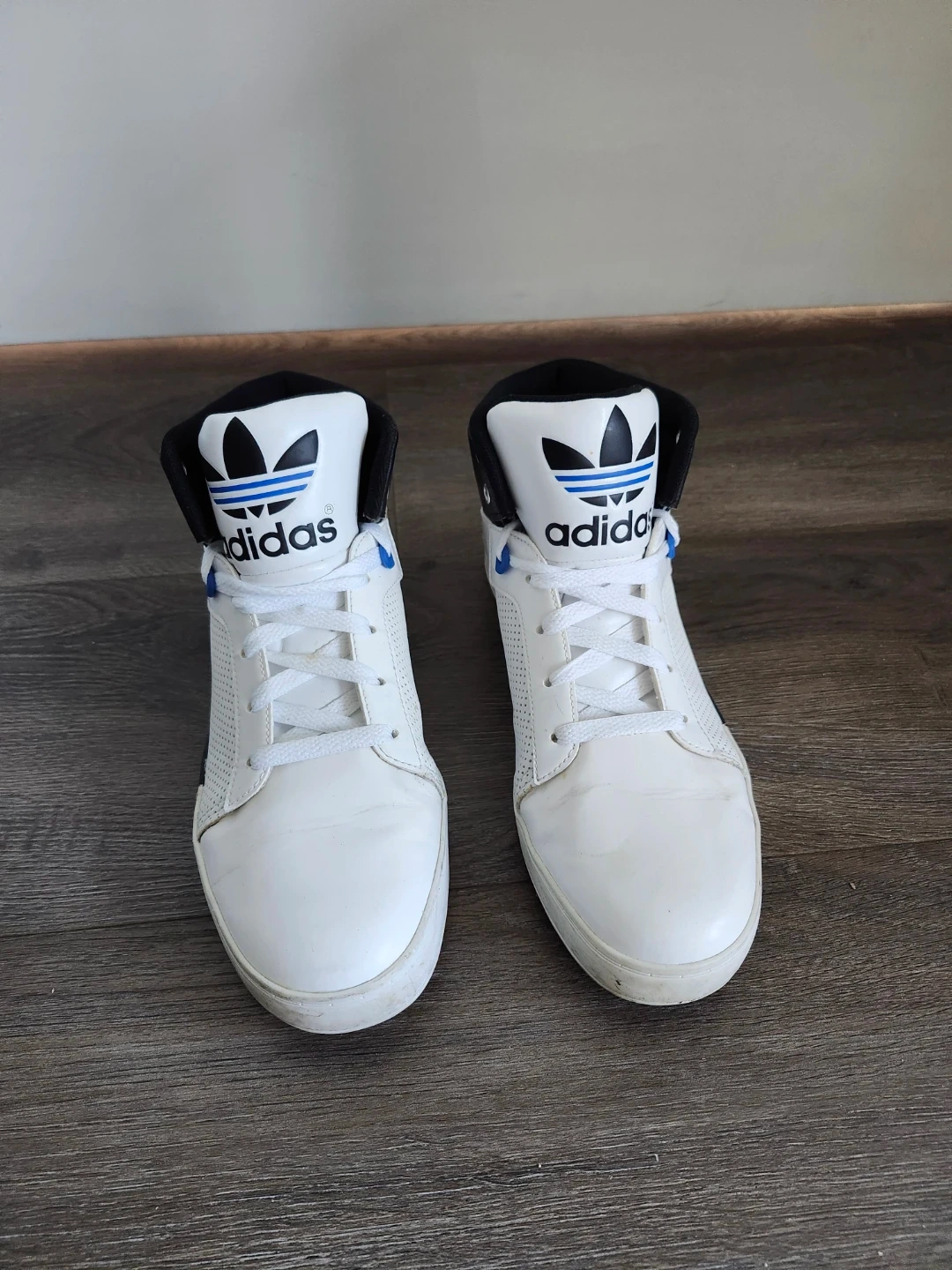 Near New. White and black Adidas high top sneakers. Features blue accent detailing and perforated toe box. Laces included.