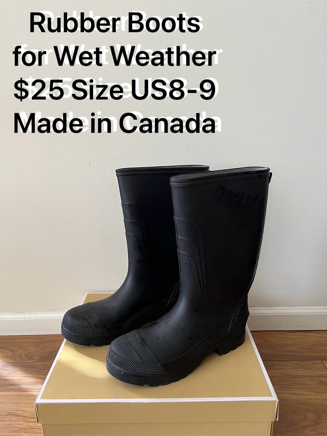 These black rubber boots are made in Canada for wet weather. They're a size US 8-9 and are perfect for keeping your feet dry. Good condition, ready for your next rainy day!