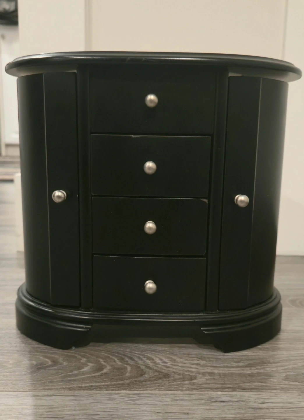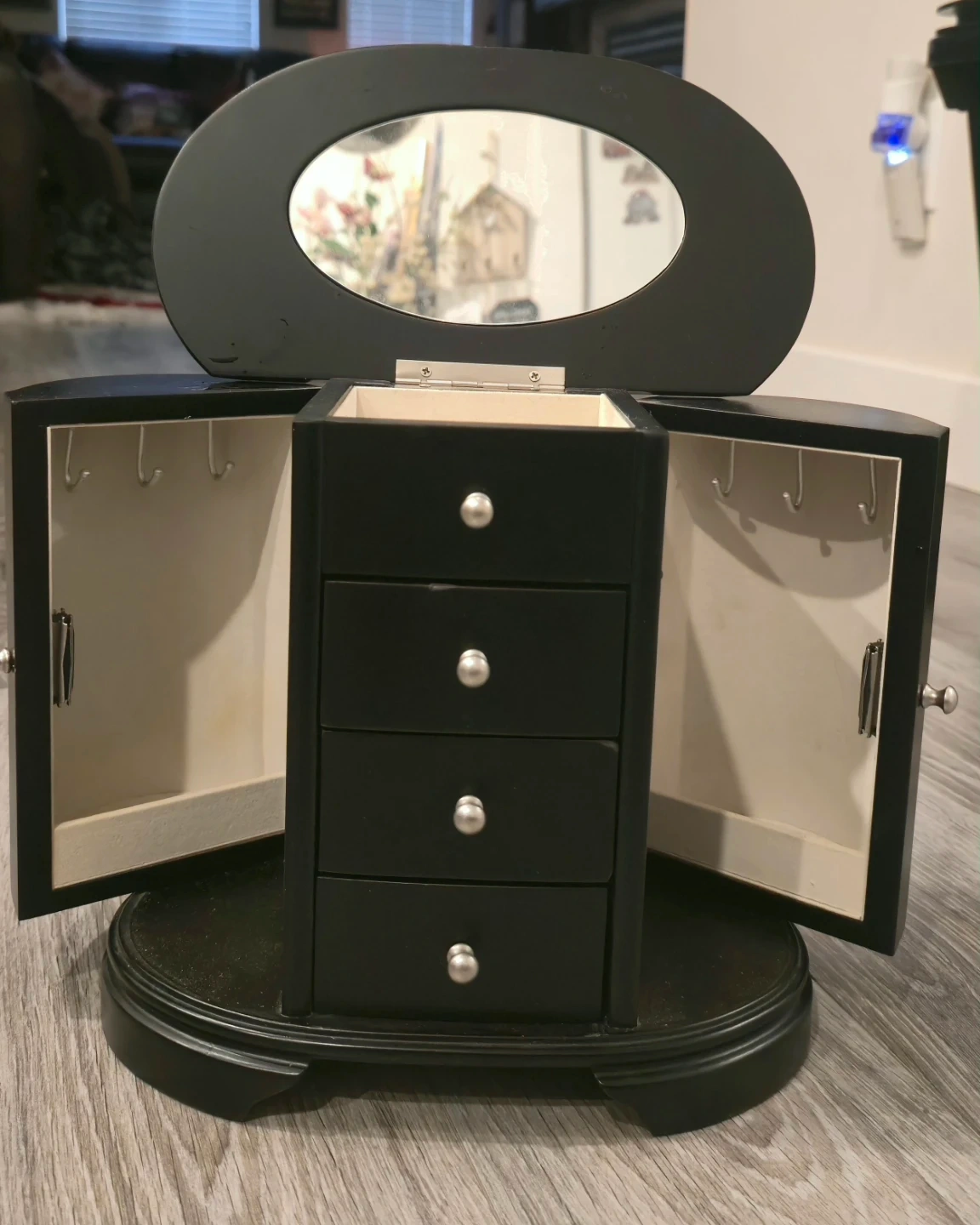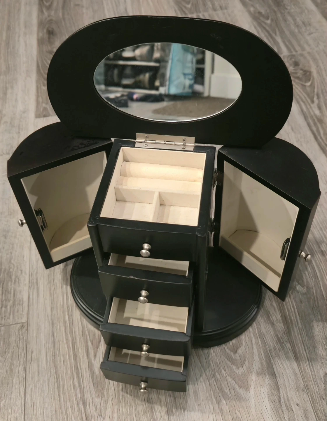 Black wooden jewelry box featuring a mirrored lid and multiple drawers for storage. It includes compartments for organizing jewellery and has small hooks inside the side doors.