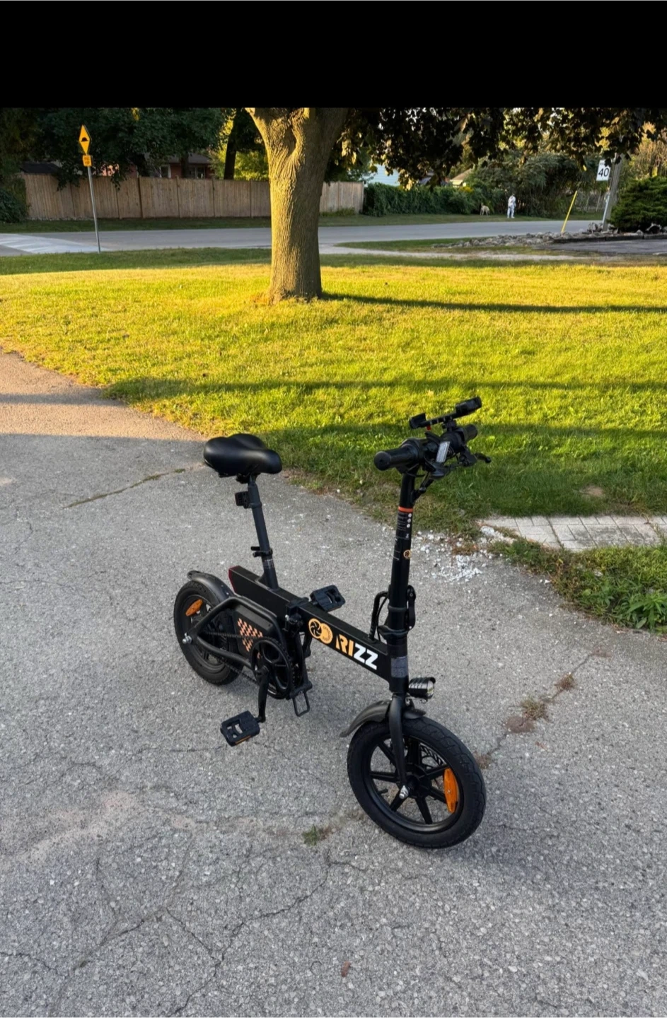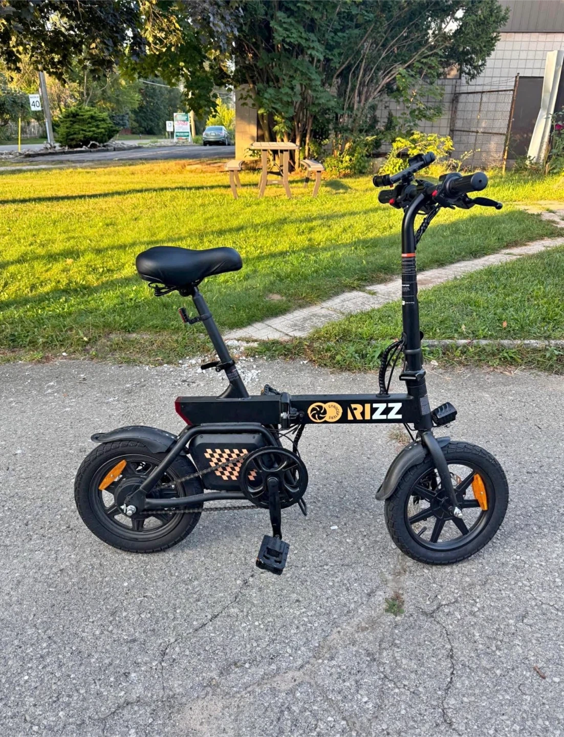 Gyrocopters Rizz Folding E-Bike: UL2849 certified, 400W peak motor, 14" tires, 25Km/h speed, 55Km range, GPS tracker, disc brakes—compact, safe & perfect for adults/teens.