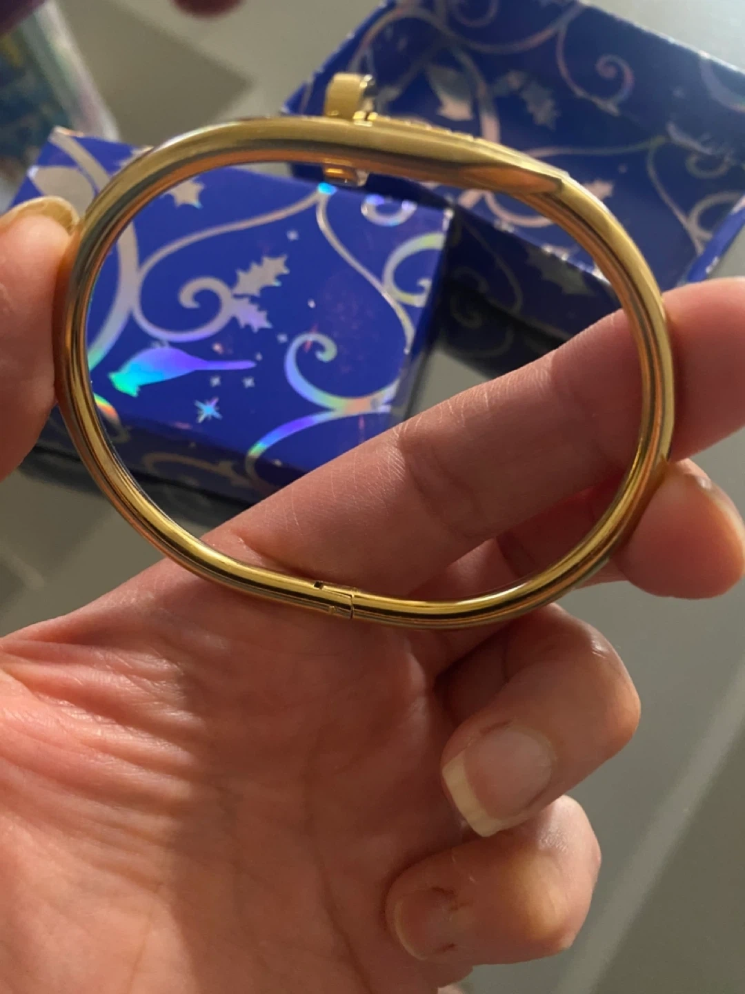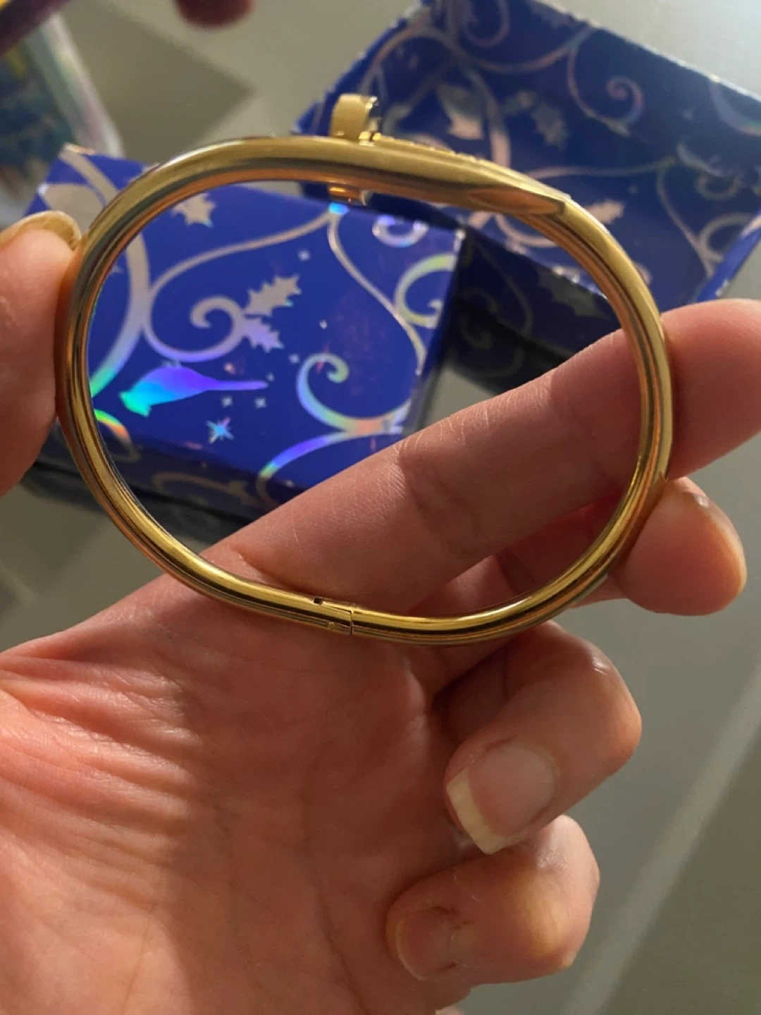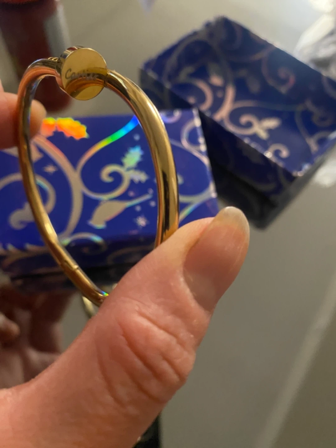This gold tone bangle bracelet features a unique nail design. It's a stylish accessory that adds a touch of elegance. The bracelet opens with a clasp mechanism.inspired by Cartier not ethentic