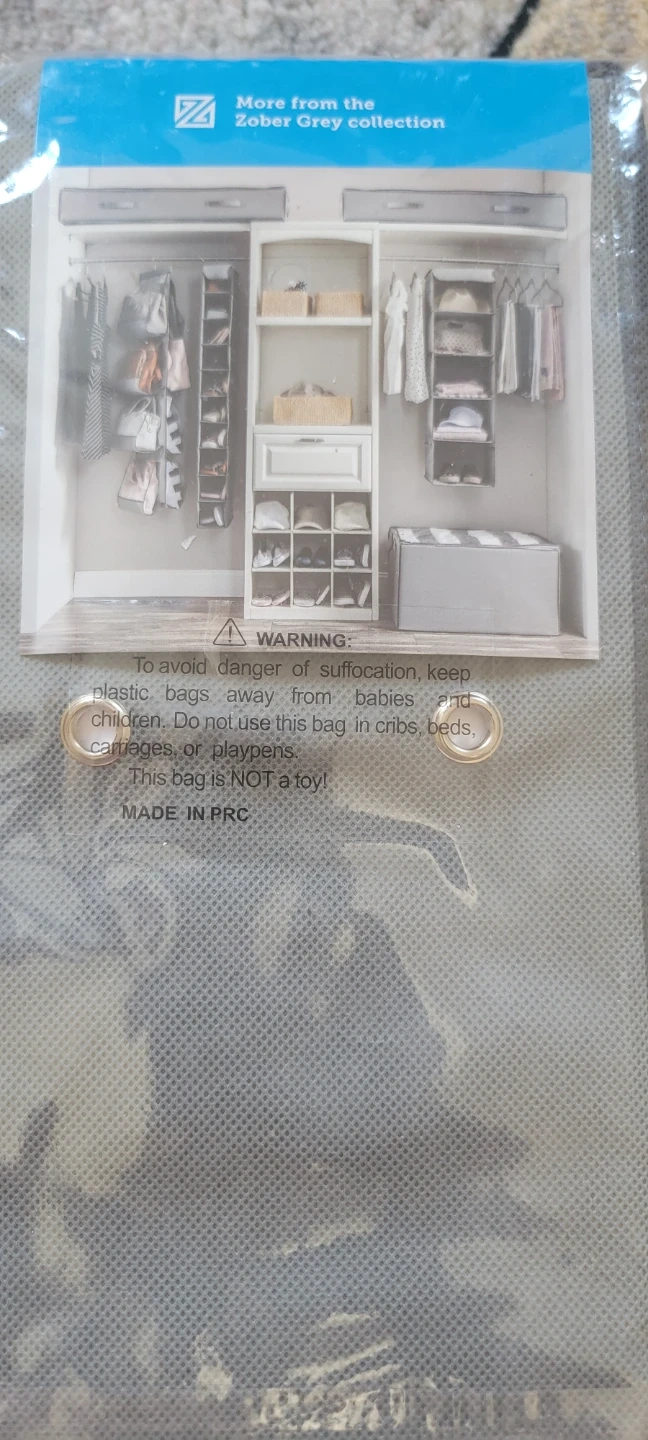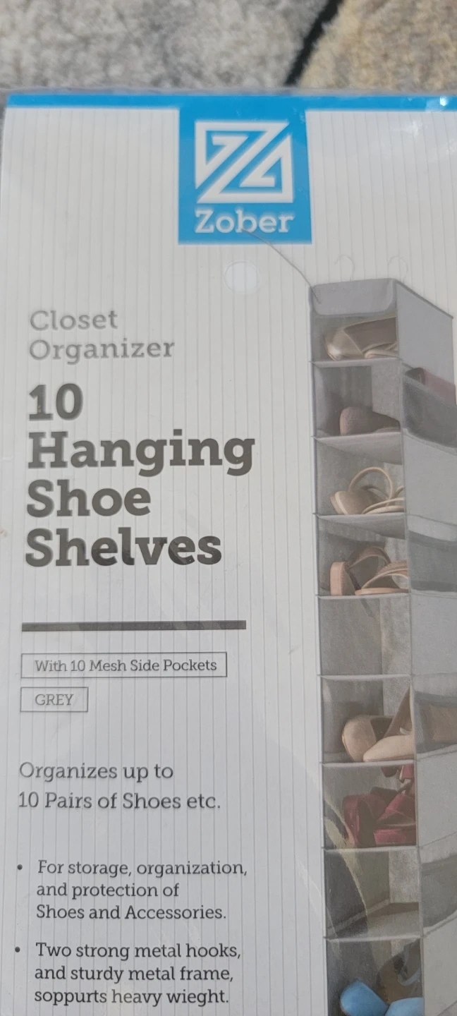 This Zober closet organizer features 10 hanging shoe shelves in grey. It includes 10 mesh side pockets for extra storage and organizes up to 10 pairs of shoes. It's made with two strong metal hooks and a sturdy metal frame to support heavy weight.