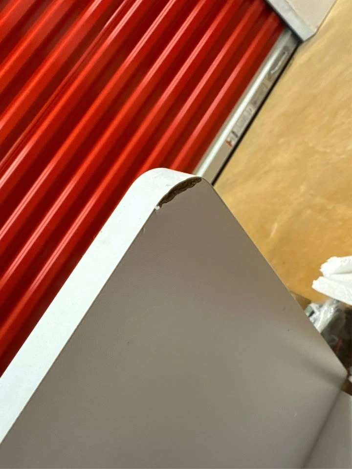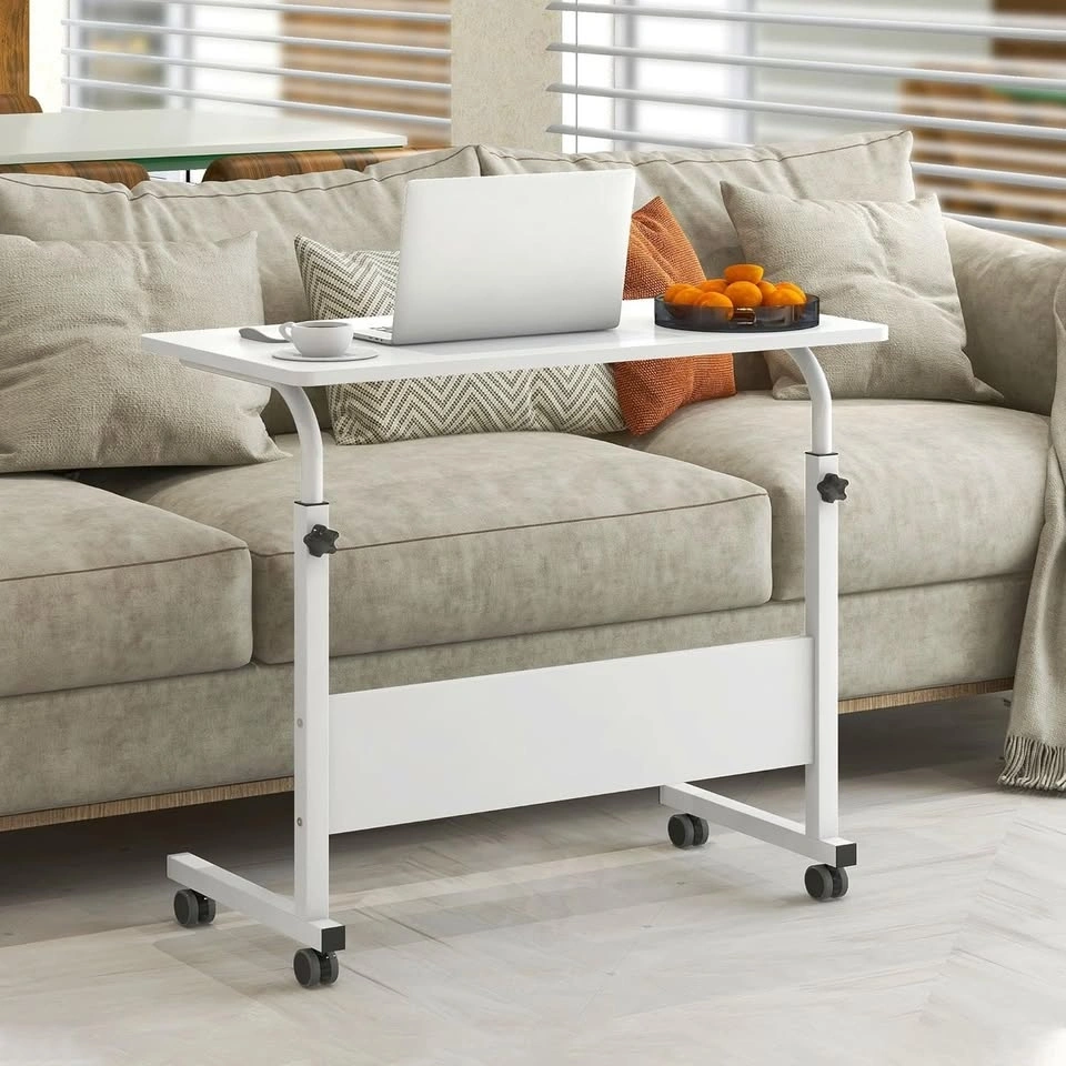 One corner is slightly damaged but easily fixable. Dimensions: 31.4"L x 15.7"W x 27.5"-34.6"H. Max load capacity: 66 lbs. This adjustable desk with wheels is simple, practical, and suitable for small spaces, matching most home or office decor. Made with an environmental particle wood panel with a high glossy, waterproof, and anti-scratch finish, and a heavy-duty powder-coated metal frame for stability and durability. Ergonomic height adjustment from sitting to standing for a healthier work style. Features 4 wheels for easy mobility, with 2 lockable wheels to keep it steady.