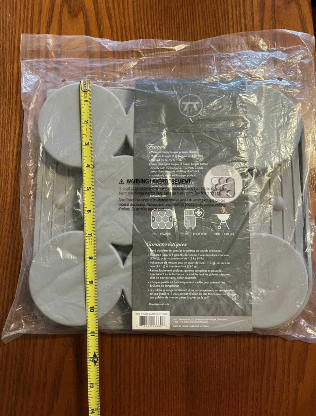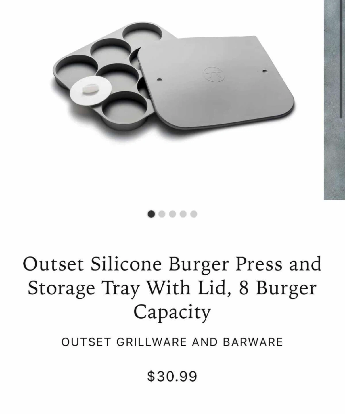 $25 Outset silicone burger press and storage tray with lid for 8 burgers.