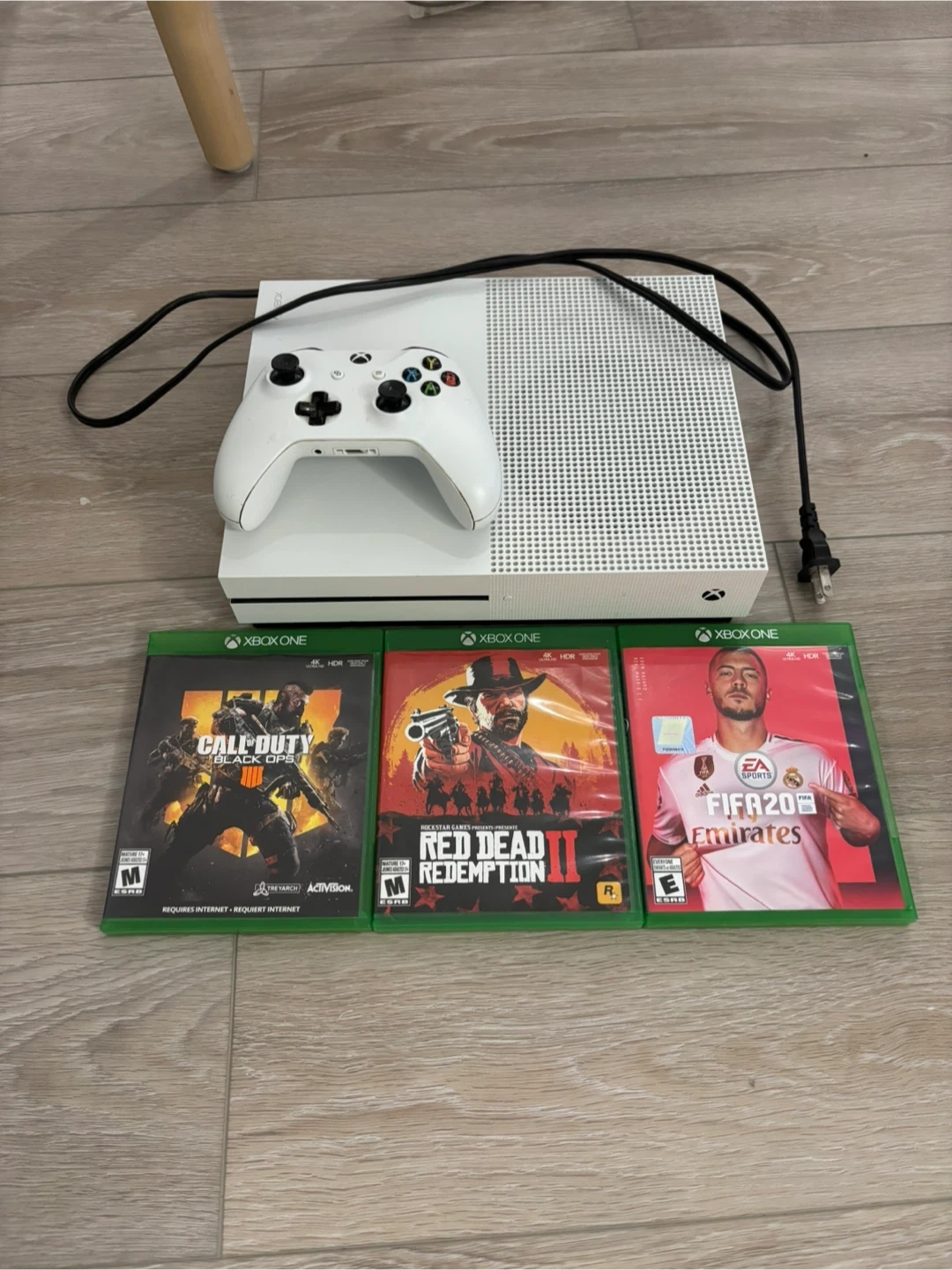 White Xbox One S console with a white controller. Includes Call of Duty: Black Ops 4, Red Dead Redemption 2, and FIFA 20. Power cable included. In excellent condition, only selling because I no longer use it.