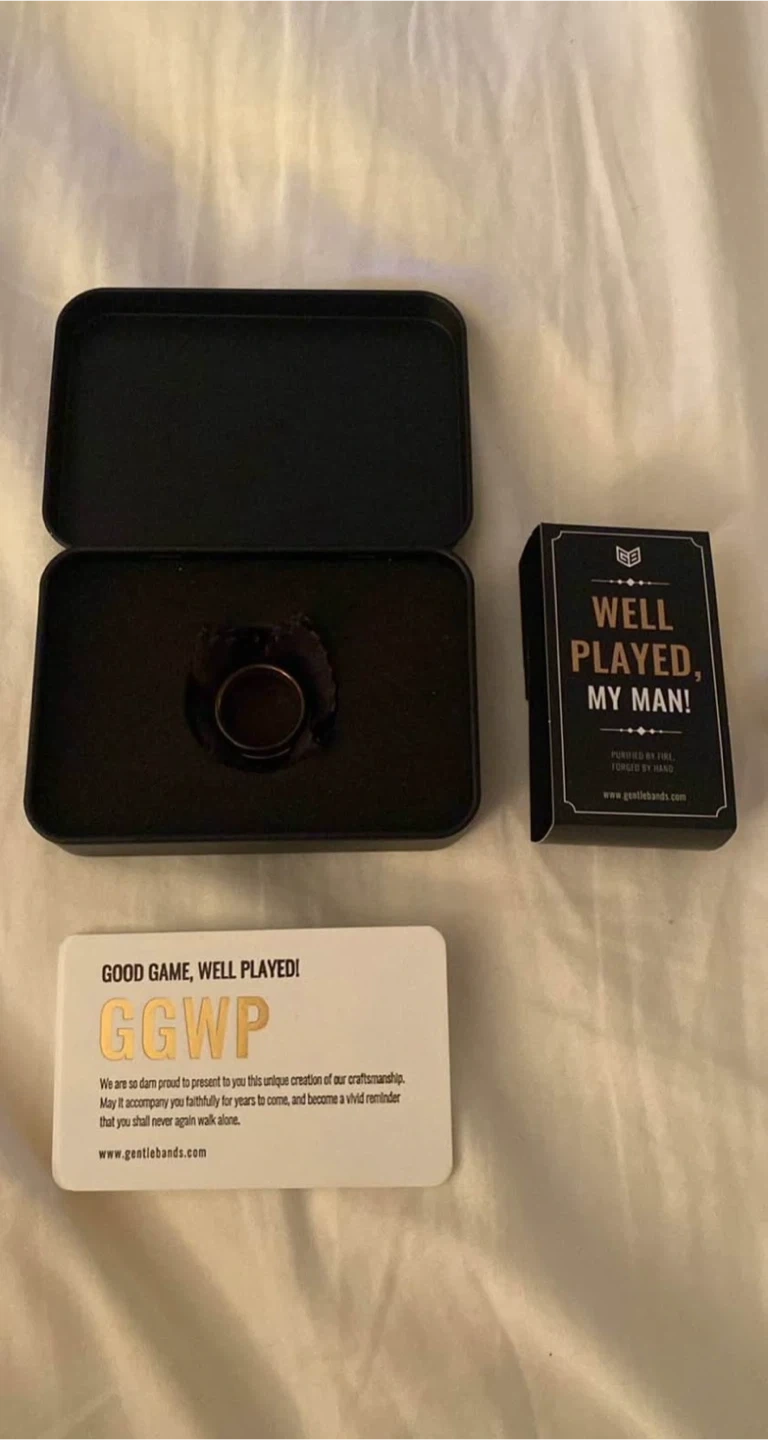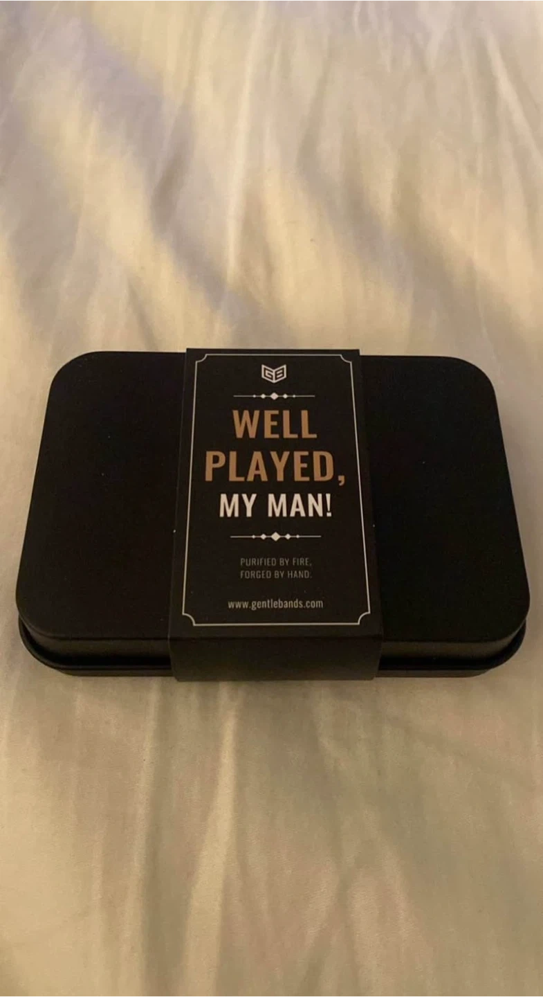 This is a Gentlebands men's ring in a black and gold design. It comes in a metal tin with a sleeve and a card. The inside of the ring is engraved with 'Forever & Always'.