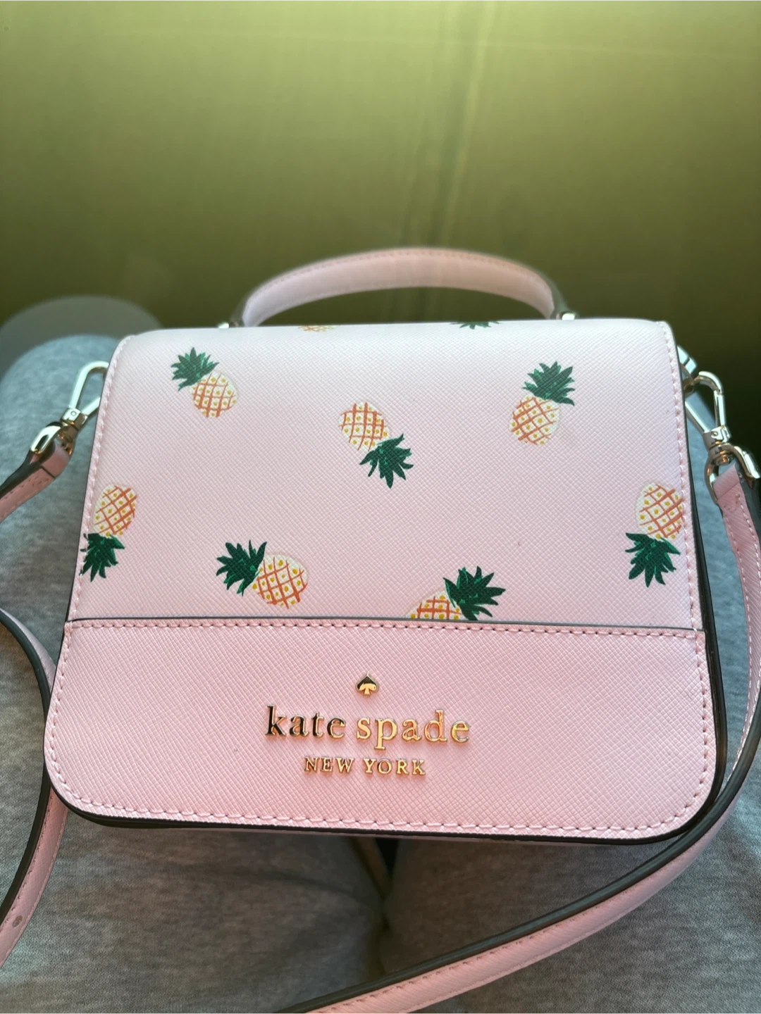 This Kate Spade New York crossbody bag features a fun pink pineapple print. It's made of crossgrain leather. This bag is great for casual outings!