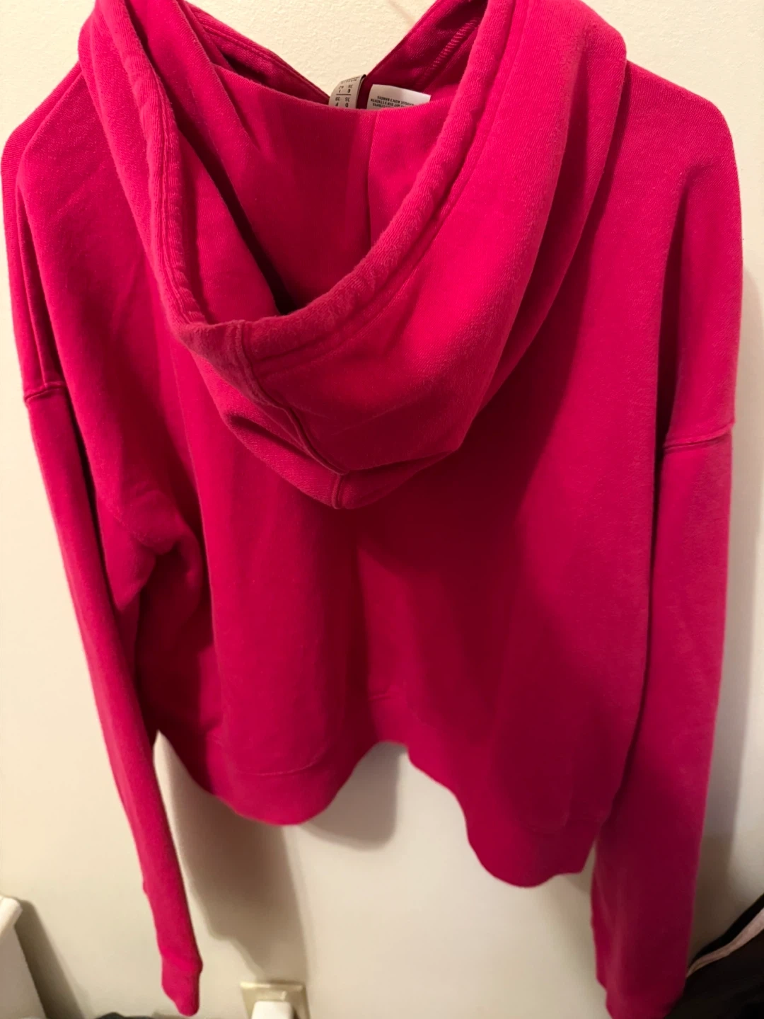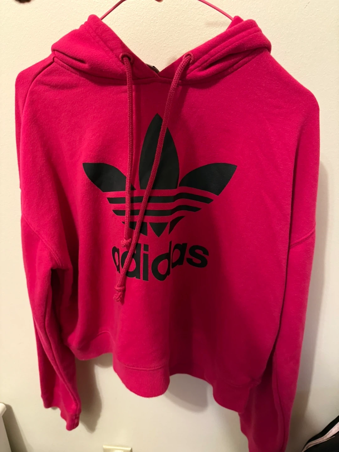 This is a bright pink Adidas cropped hoodie. It's a size S with the classic trefoil logo on the front. Made in Indonesia.
