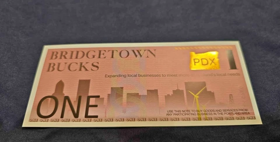 Up for sale is a beautiful, crisp 1 Buck Bridgetown Bucks note from the PDX Currency Corporation in Portland, Oregon. This is not just a piece of paper; it’s a piece of Pacific Northwest economic history. Launched around 2012, Bridgetown Bucks were a local community currency designed to keep money circulating within Portland’s independent businesses. Now that the program is retired and the notes are no longer in active circulation, they have become highly sought-after by collectors of "Obsolete" and "Complementary" currencies. The reverse features a classic architectural sketch of Portland’s iconic Steel Bridge. This isn't "play money." It features a high-visibility Gold Foil PDX/Oregon state stamp on the front, professional serial numbering (Series 1), and a specialized polymer-blend feel. This note is in excellent condition—crisp, clean, and uncirculated. No folds, creases, or pinholes. A perfect example of the "Buy Local" movement of the early 2010s. As these notes disappear into private collections, finding high-grade individual singles like this is becoming increasingly difficult. A fantastic addition for any collector of US Paper Money, Oregon memorabilia, or unique financial history.