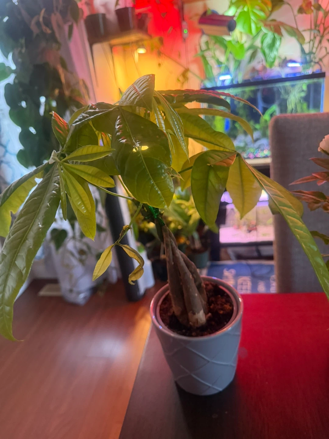 A healthy Money Tree plant in a light blue ceramic pot. This plant's braided trunk and lush green leaves make it a beautiful addition to any home.