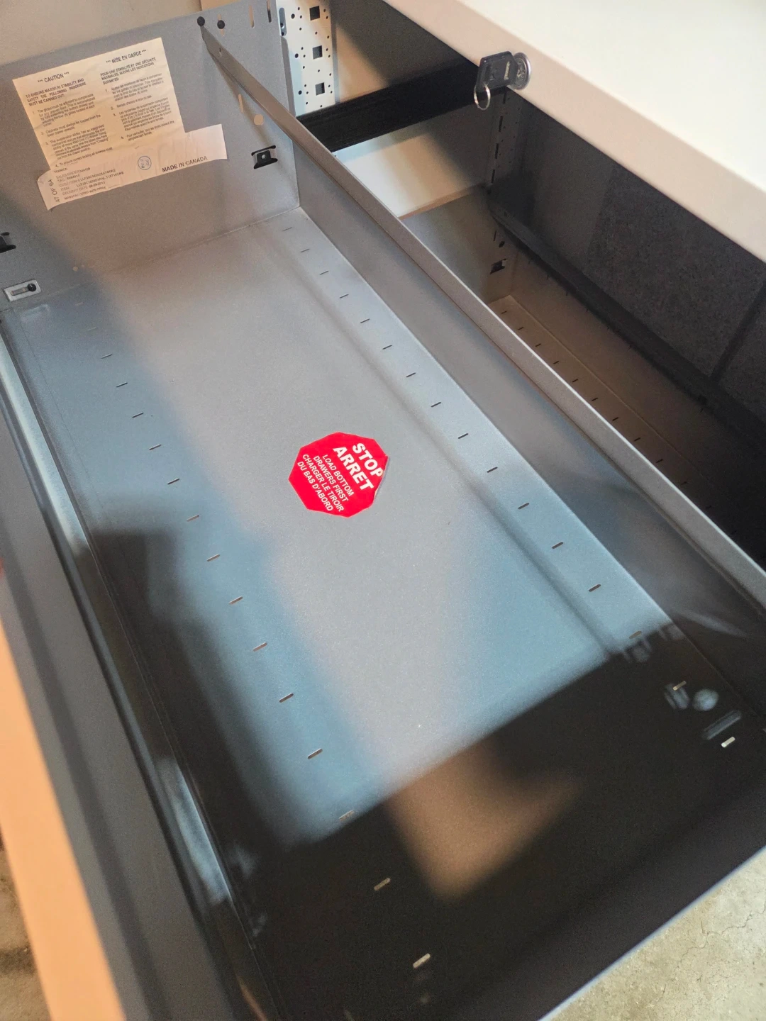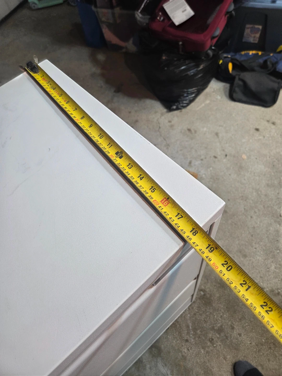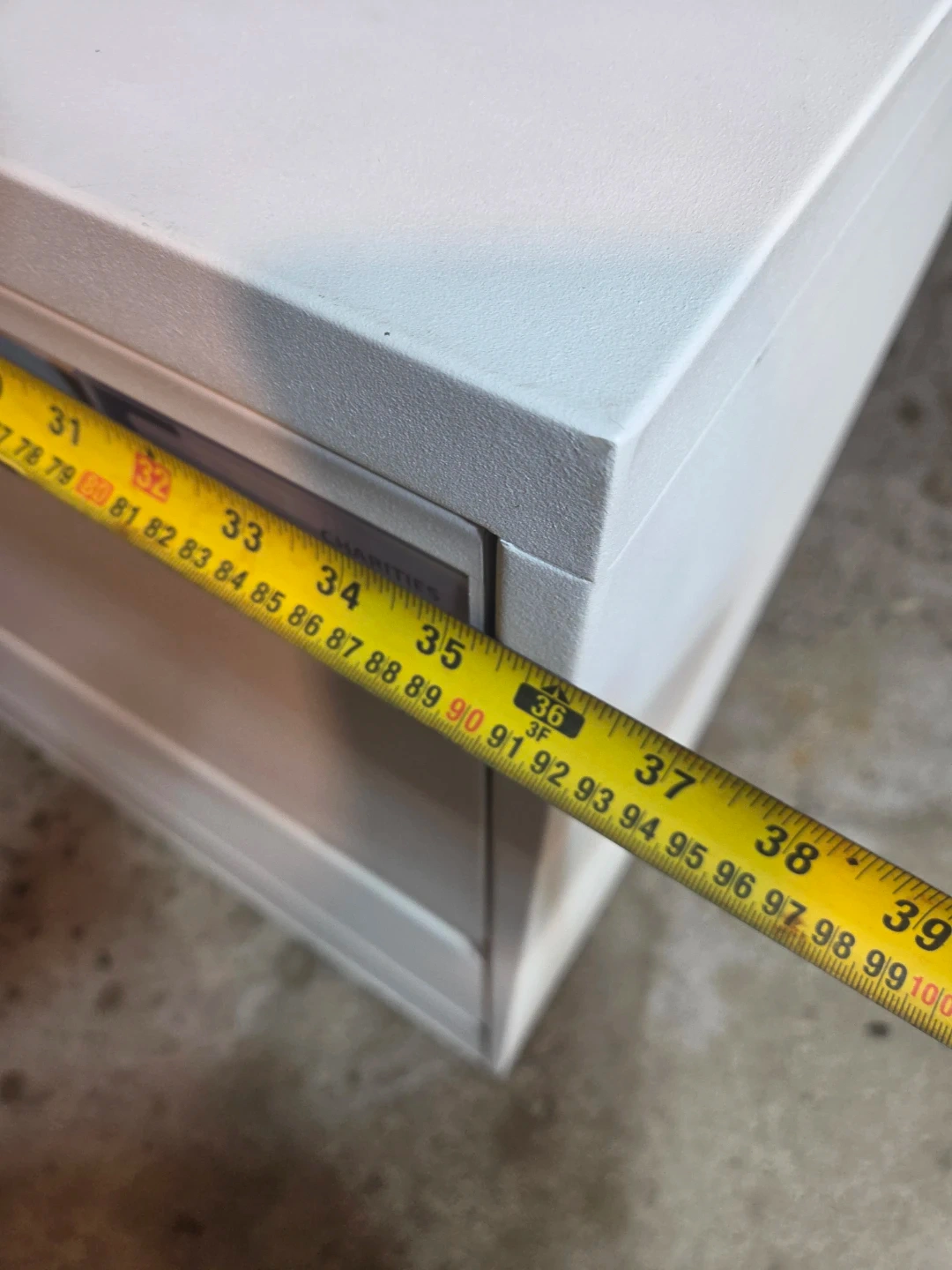 This is a white, three-drawer filing cabinet. It's made of metal for durability. Perfect for organizing your office documents! Bought for $500, selling for $300 OBO.