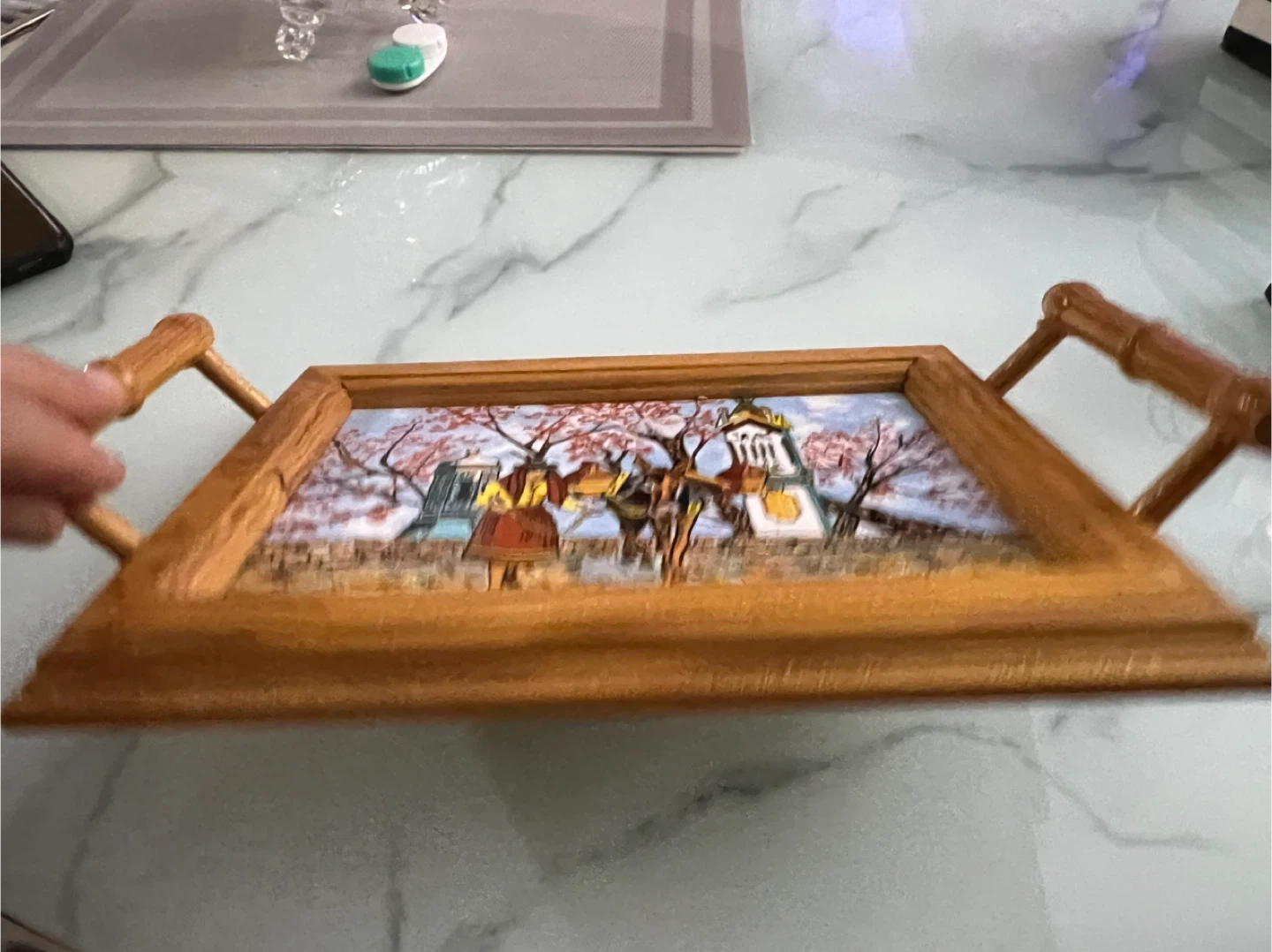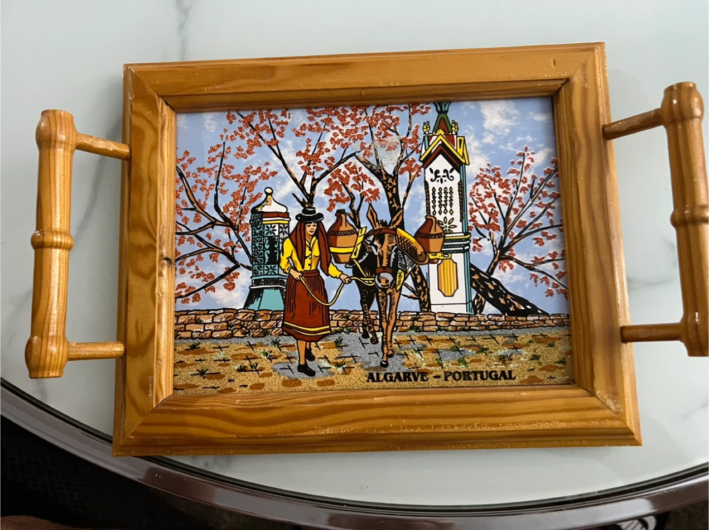 This decorative tray features a charming scene from Algarve, Portugal, with a woman and a donkey. It has a wooden frame and handles, perfect for displaying or light use. Wood construction.