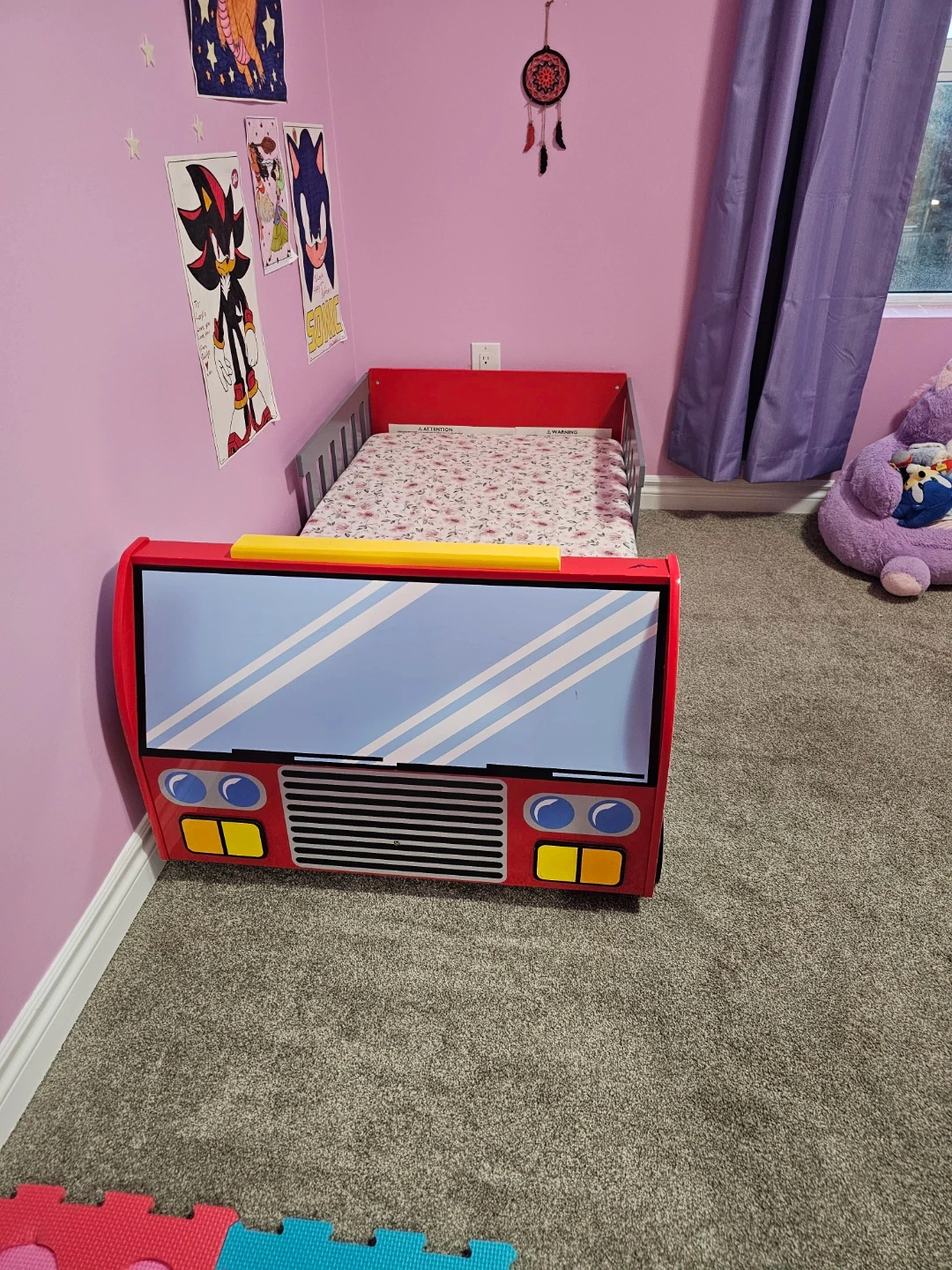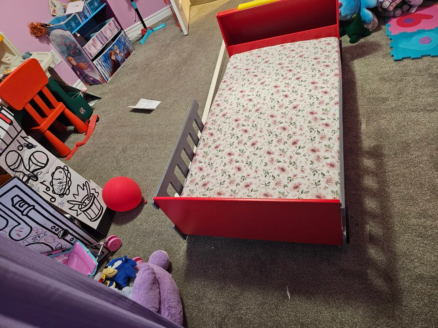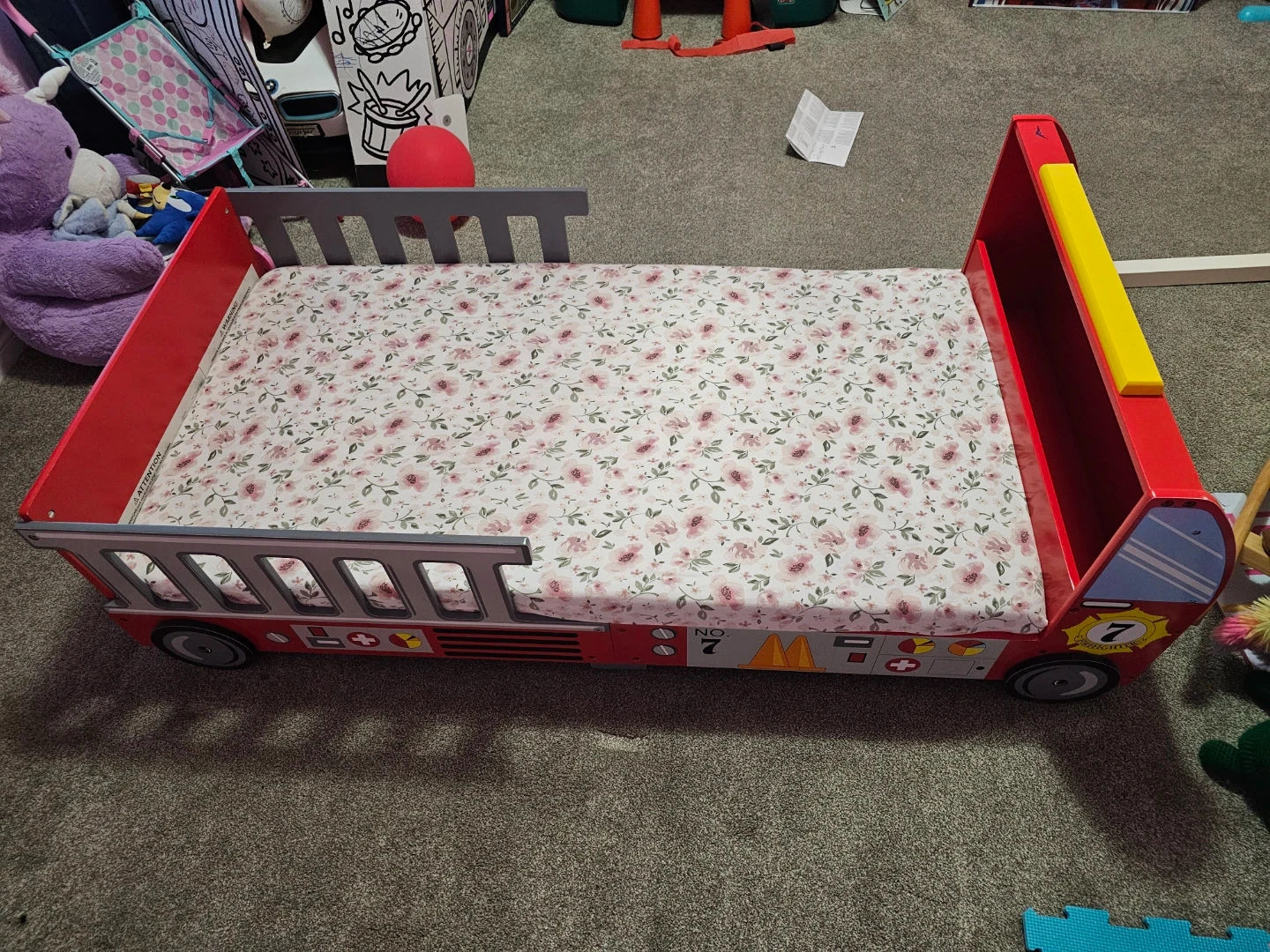 This red toddler bed is designed to look like a fire truck. It has guardrails on the sides to keep little ones safe. Minor cosmetic damage. The mattress (crib size) is optional.