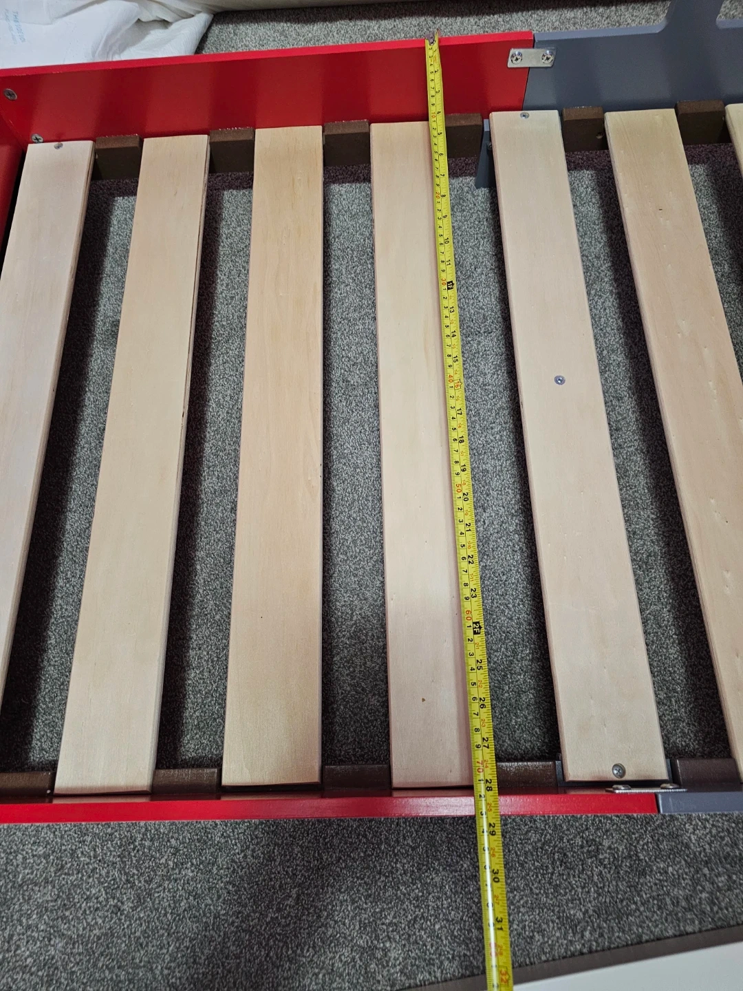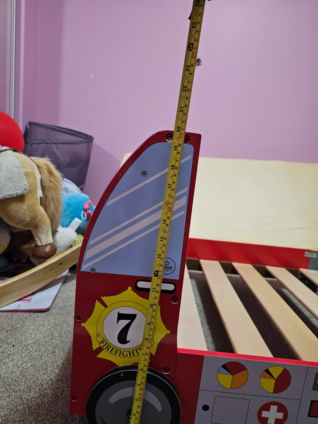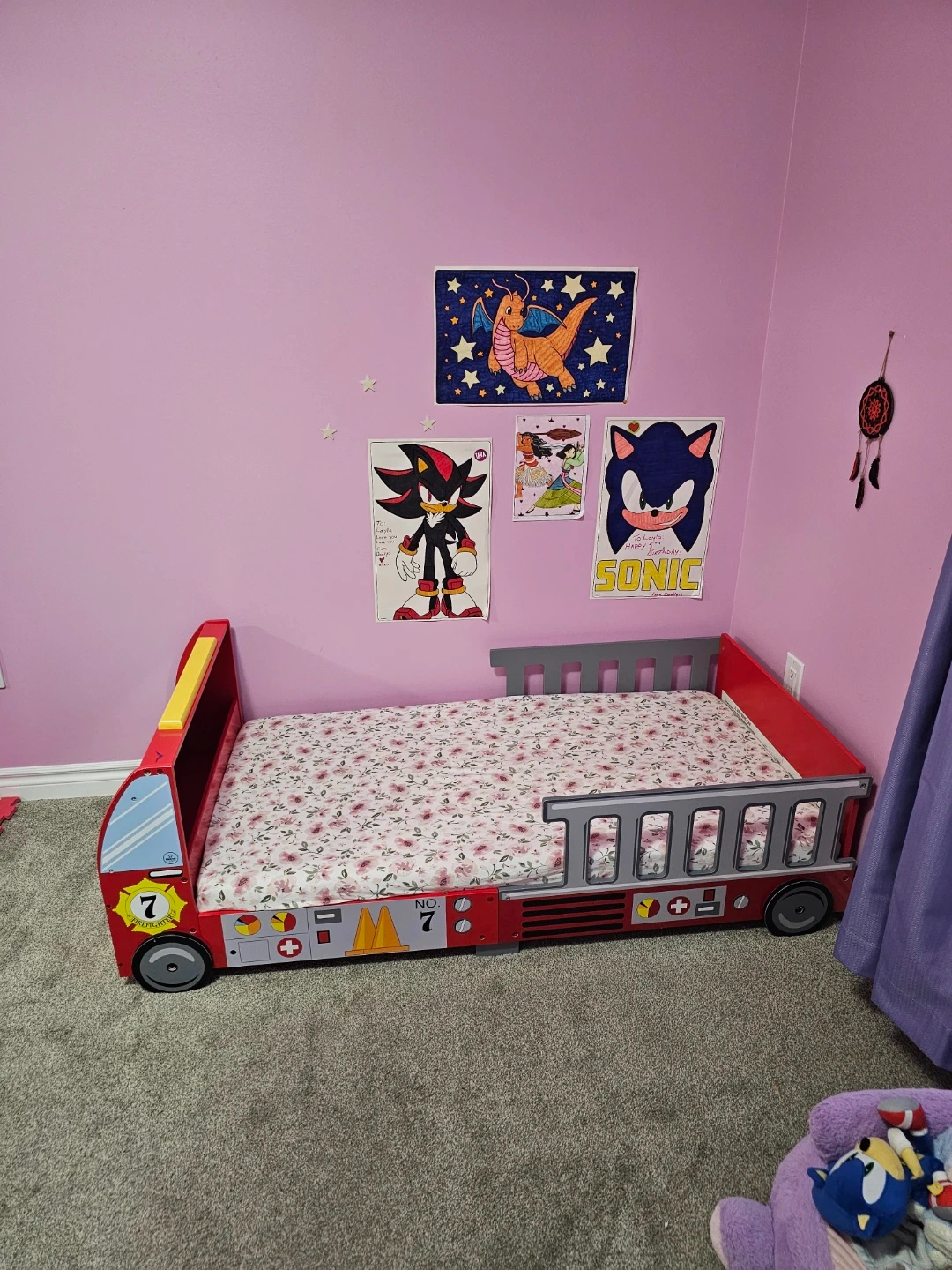 This red toddler bed is designed to look like a fire truck. It has guardrails on the sides to keep little ones safe. Minor cosmetic damage. The mattress (crib size) is optional.