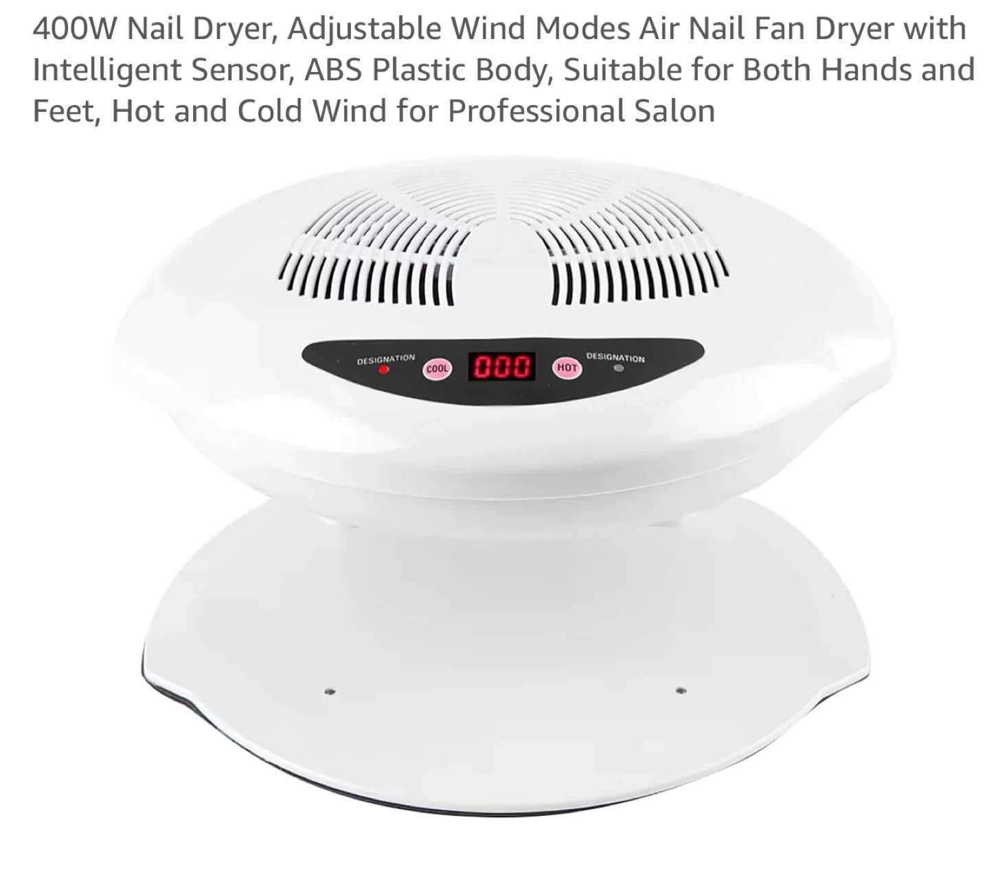 This 400W nail dryer features adjustable wind modes, offering both hot and cold air. It has an ABS plastic body and a widen air outlet for a bigger working area. The intelligent sensor design makes it convenient to use.
