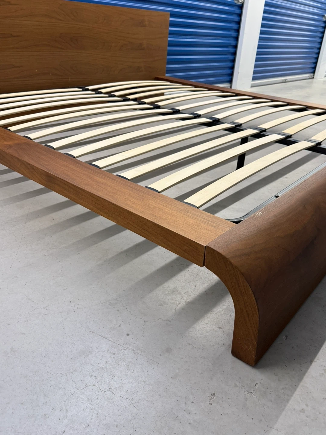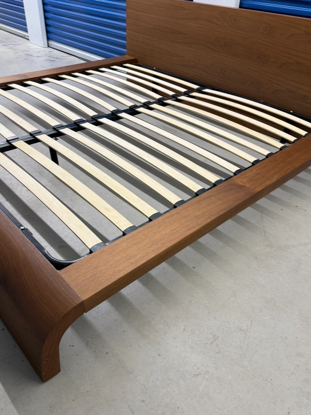 This is a wooden platform bed frame featuring a modern design with a curved footboard and a simple headboard. It includes a slatted support system for your mattress. The wood finish is a warm, natural tone.