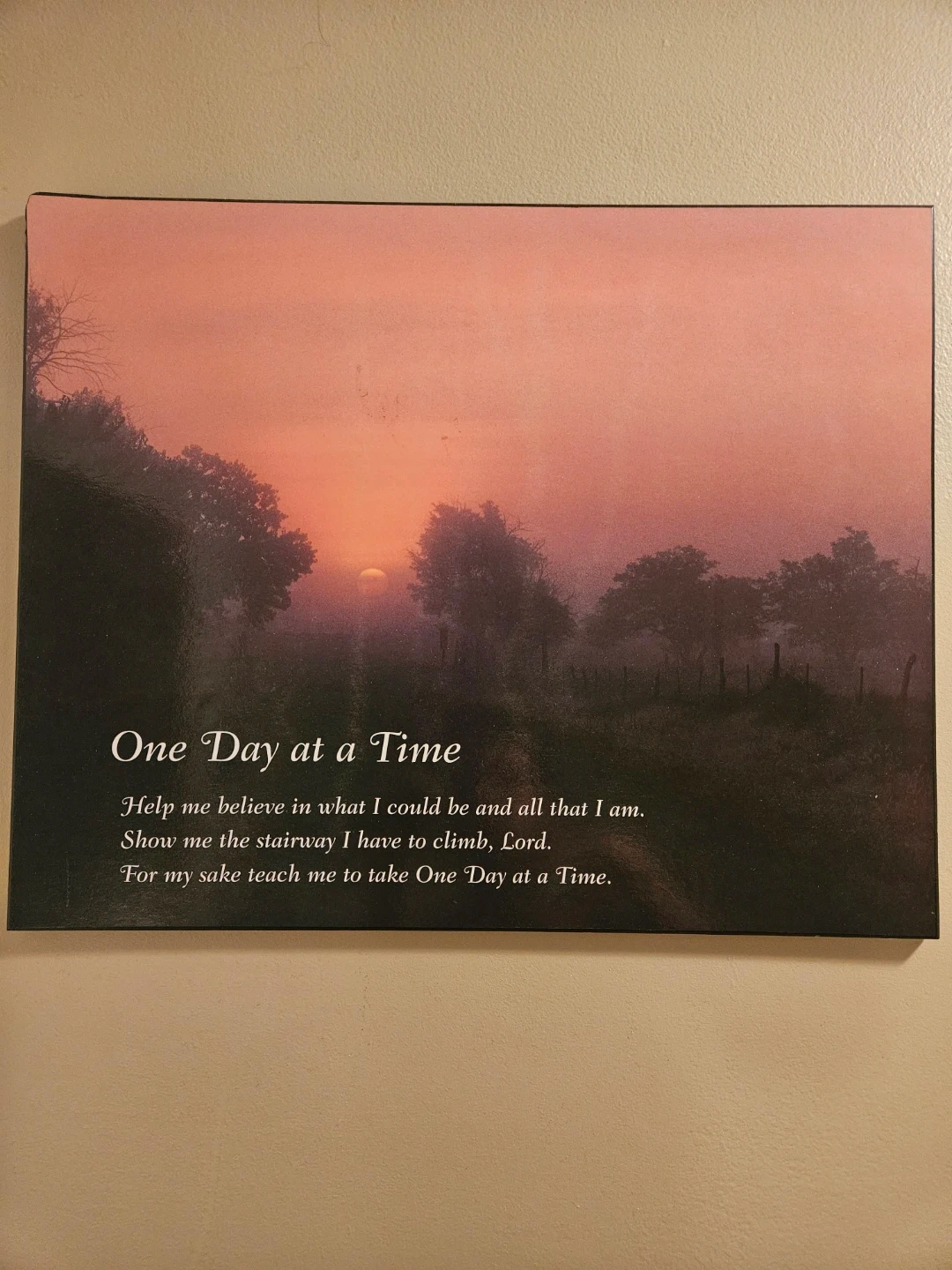 Brighten your space with this inspirational wall art, featuring a serene sunset scene and the uplifting message "One Day at a Time." This piece is perfect for adding a touch of peace and motivation to any room. The canvas is in used, but good condition, ready to hang and inspire daily. It's just the thing to remind you that even if you feel like you're walking through molasses, you'll get there 'one day at a time'. 20 x 16 inches.