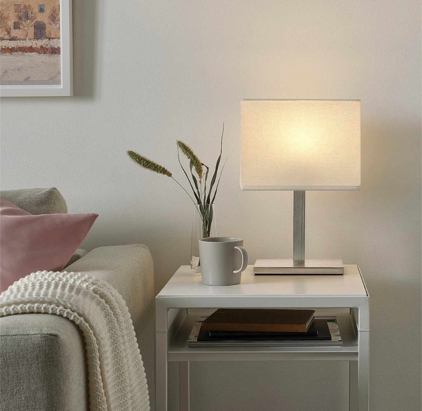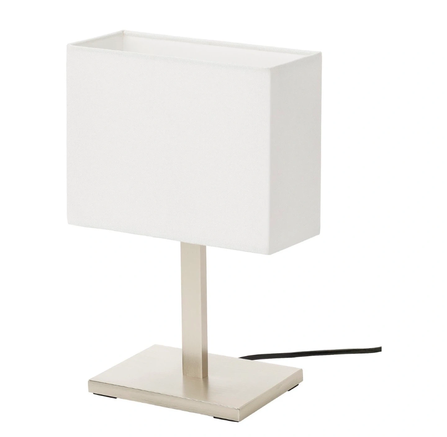 This is a classic IKEA FADO table lamp with a white fabric shade and a brushed metal finish. It's a nice size for a bedside table or desk. It provides a soft, ambient light.