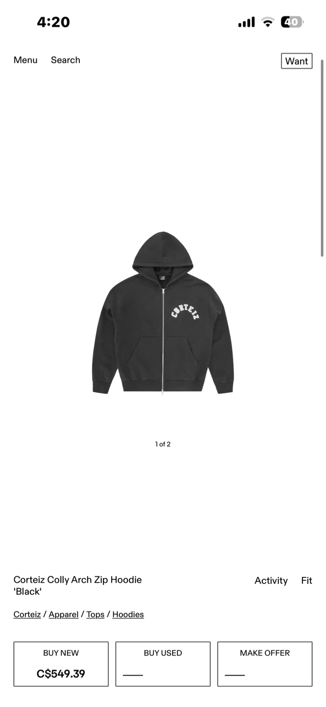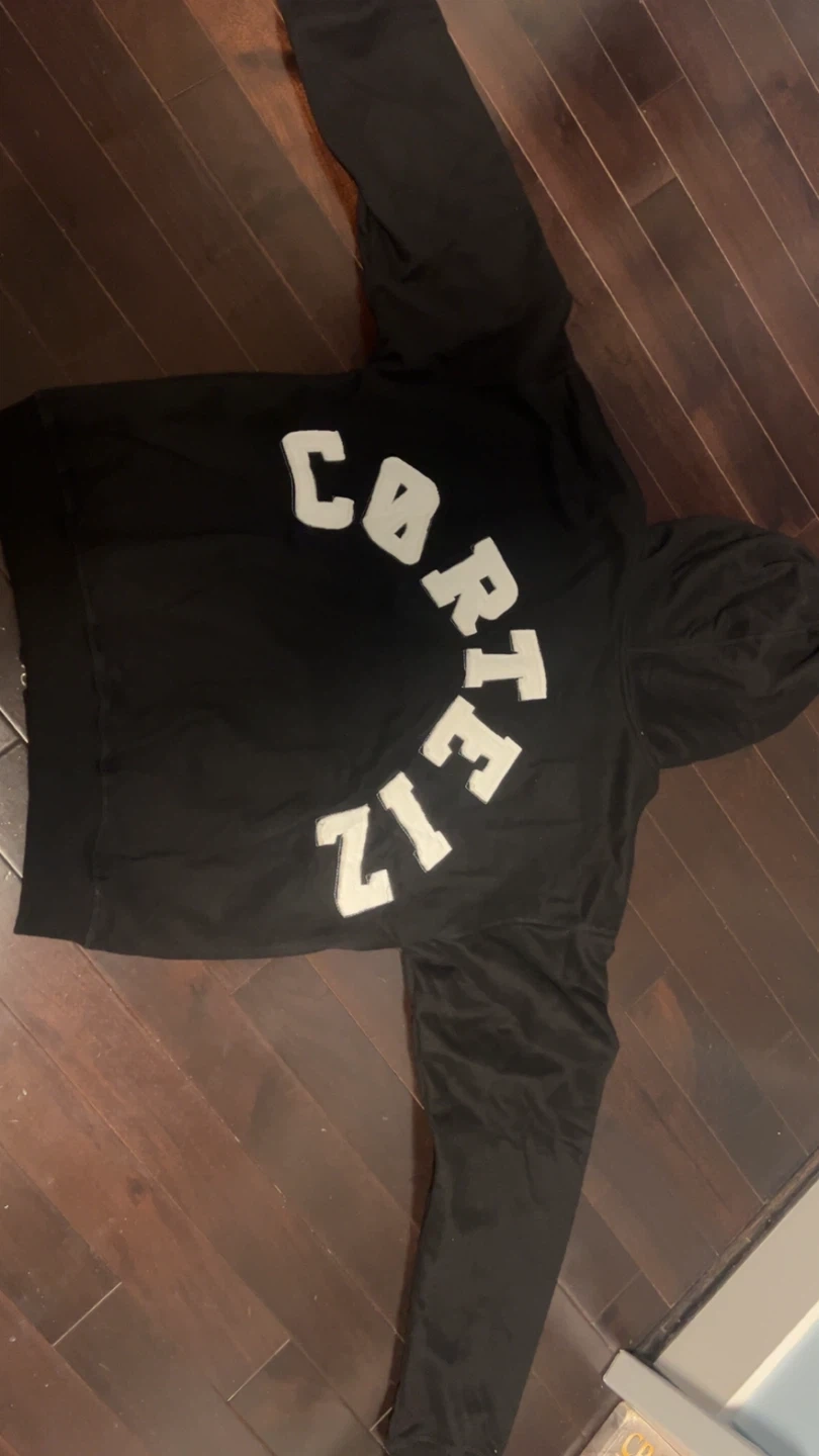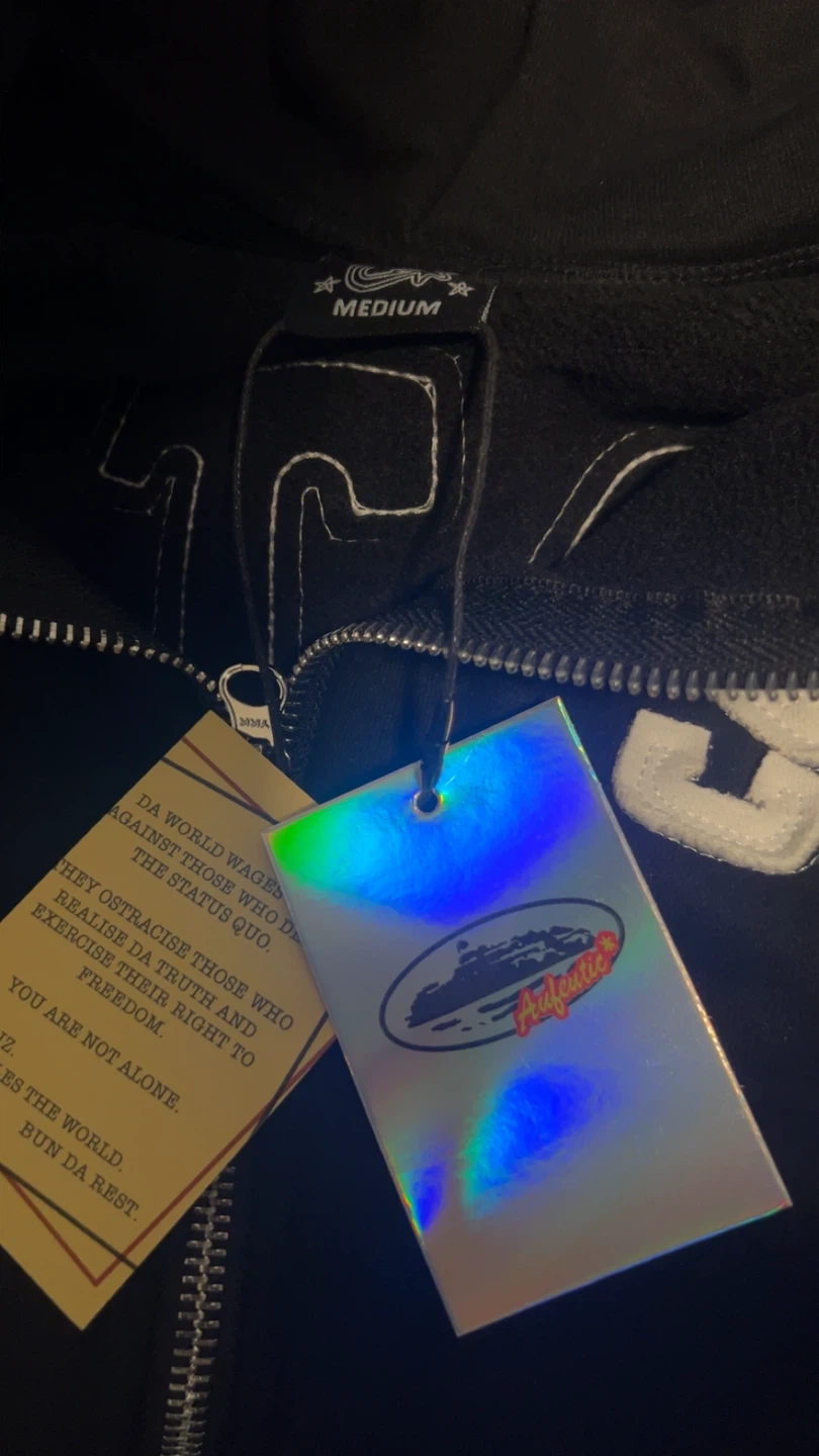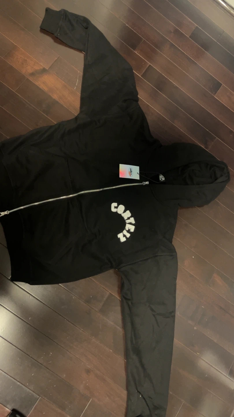 Selling a Corteiz black zip-up hoodie in size medium. It's in great condition and ready for a new owner! The design features the brand name on the back.