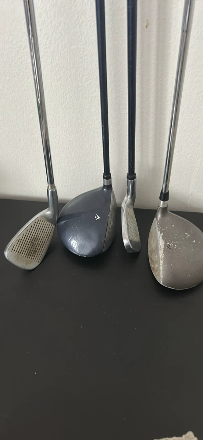 Set includes four golf clubs Various brands are represented, and some clubs show signs of use. This is a good starter set for someone looking to get into the sport.