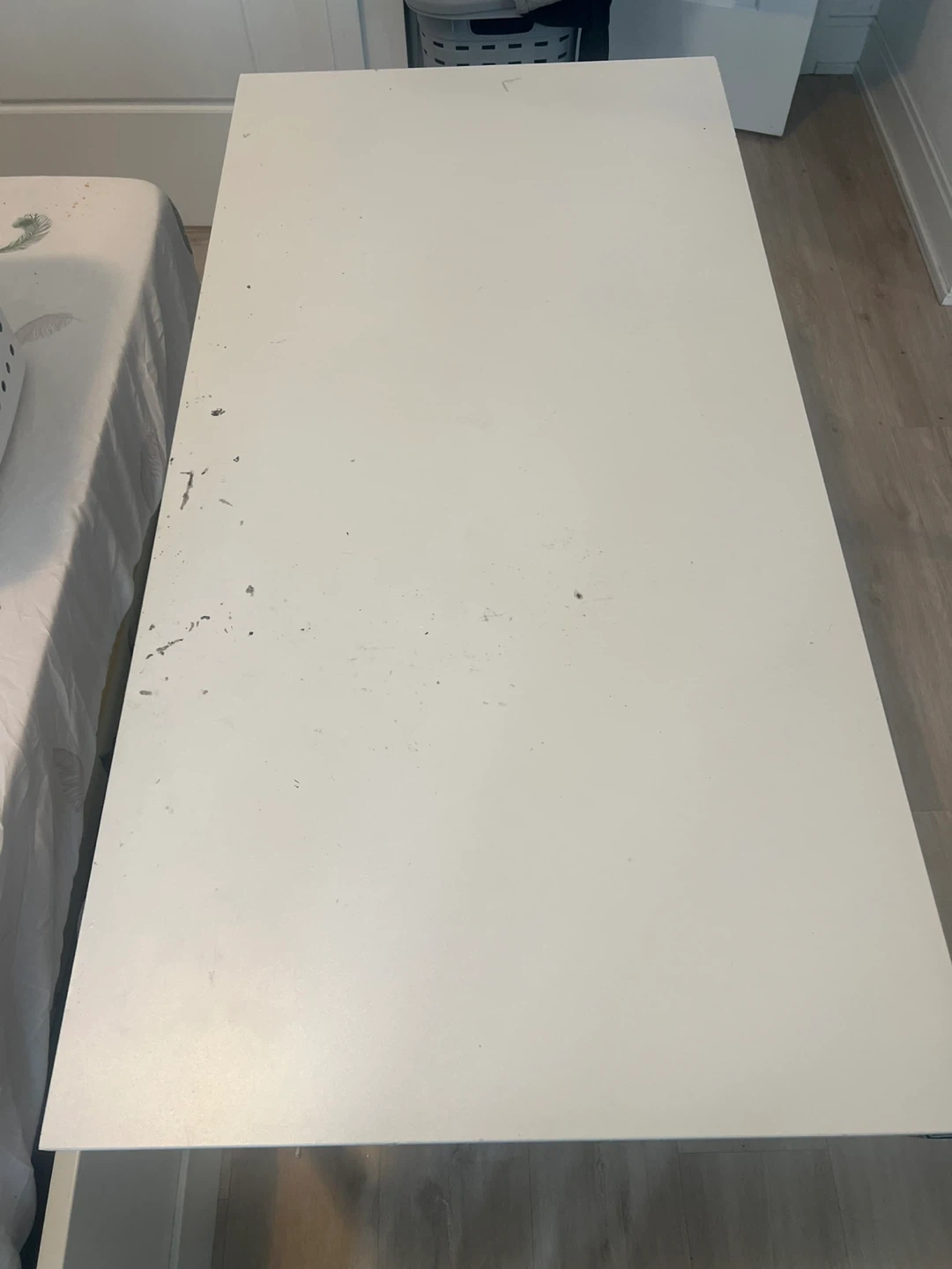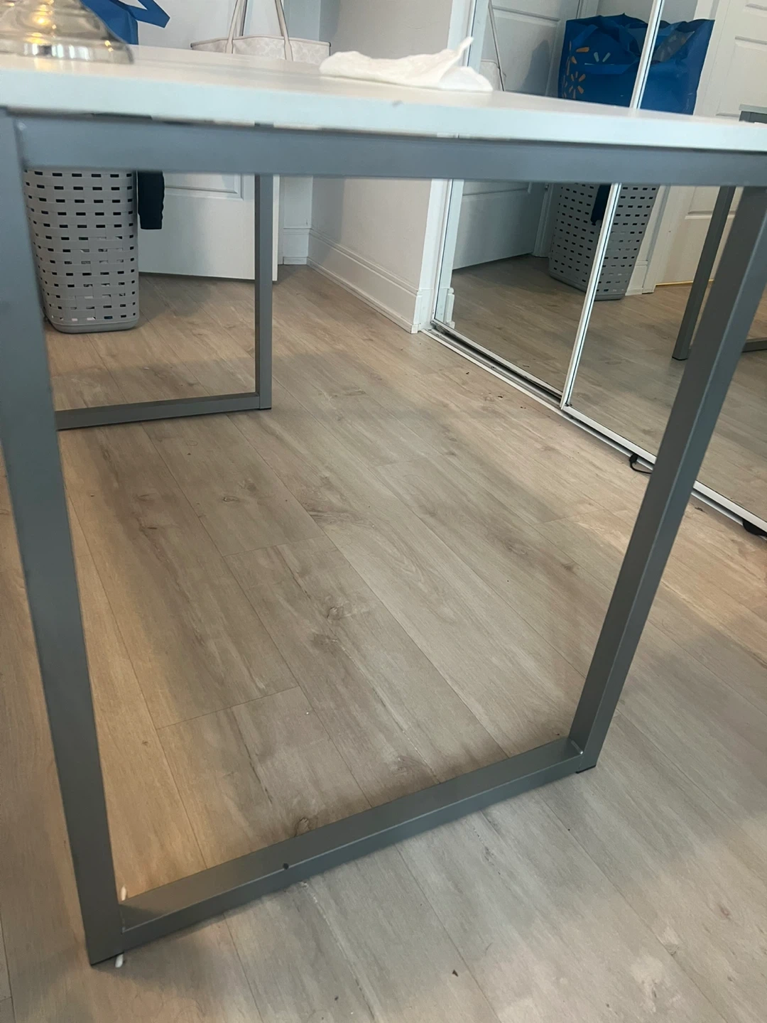 Selling a white desk. It has a grey metal frame. There are some signs of wear and tear on the top surface.