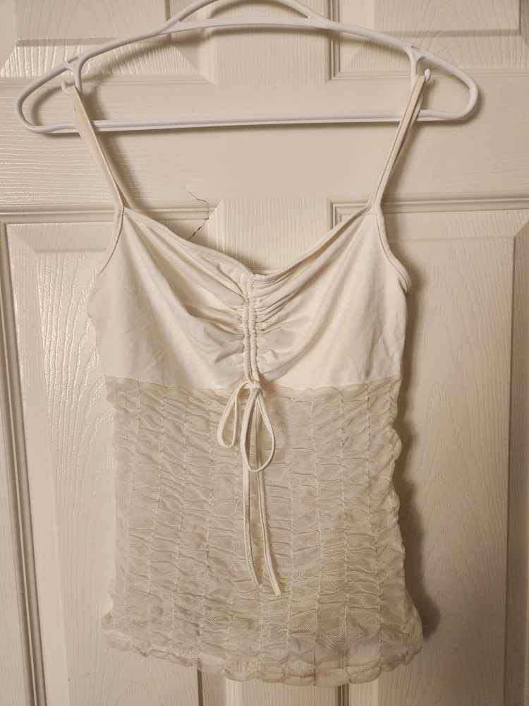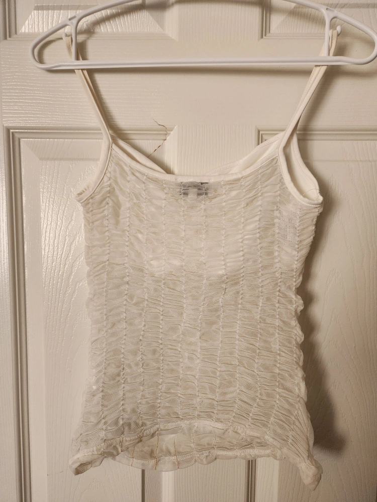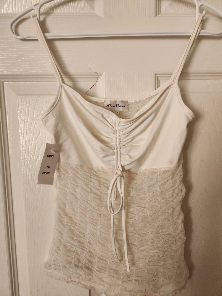 Here's a cute Blanc Nature tank top in a size 38! It's white and features a unique gathered design on the front and a mesh-like bottom half. Perfect for layering or wearing on its own during warmer weather
